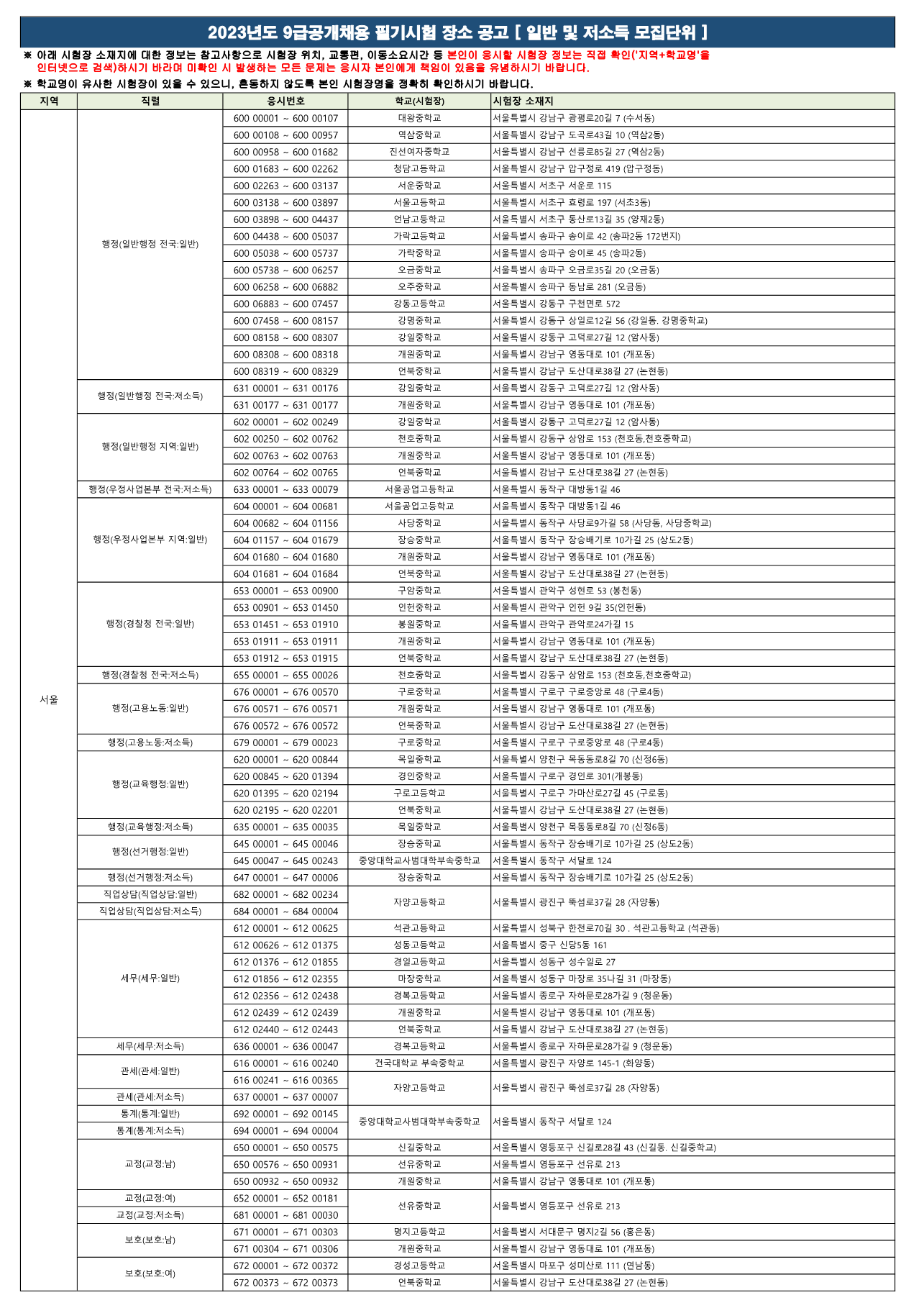 - xlsx 파일 2. 2023년도 국가공무원 9급 공채 필기시험 시험장소 공고(일반 및 저소득 모집단위).xlsx 다운로드