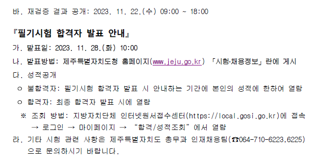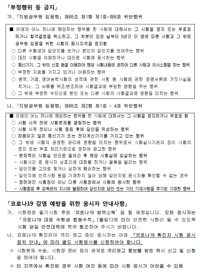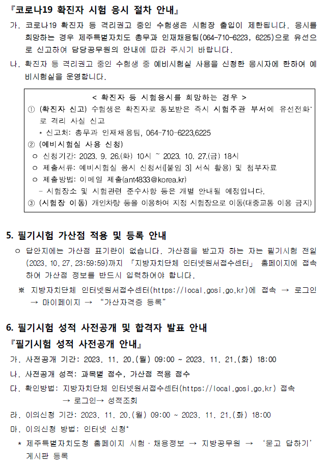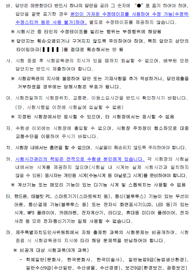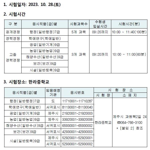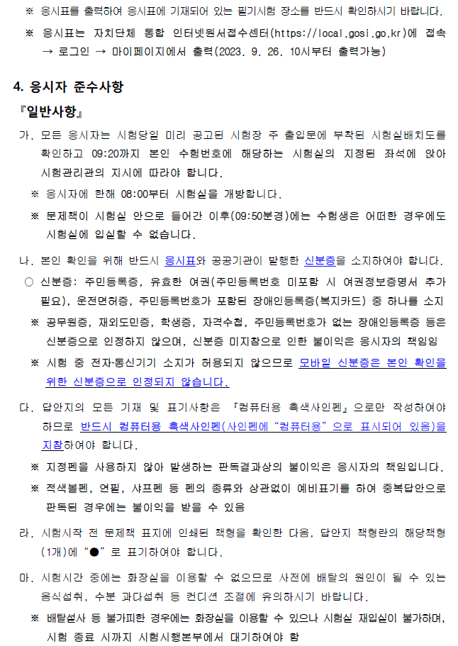 [[시험장소]]2023 제5회 제주도 지방공무원(7급 등) 임용 필기시험 장소공고 (시험: 10.28) 작성자9꿈사운영위|작성시간23.10.06|조회수170 목록 댓글 0 글자크기 작게가 글자크기 크게가 01.(인사위공고-581호)2023년도 제5회 제주특별자치도 지방공무원 임용시험 필기시험 시간 및 장소 공고.hwp325.50KB02.(별첨1) 2023년도 제5회 공개경쟁임용 필기시험 편의지원 검증결과 안내(게시).hwp50.50KB03.(별첨2) 코로나19 예방을 위한 응시자 유의사항 안내문.hwp2.41MB 첨부파일첨부된 파일이 9개 있습니다. png 파일 제주도 시험장소1.png 다운로드 png 파일 제주도 시험장소6.png 다운로드 png 파일 제주도 시험장소5.png 다운로드 png 파일 제주도 시험장소4.png 다운로드 png 파일 제주도 시험장소2.png 다운로드 png 파일 제주도 시험장소3.png 다운로드 hwp 파일 02.(별첨1) 2023년도 제5회 공개경쟁임용 필기시험 편의지원 검증결과 안내(게시).hwp 다운로드 hwp 파일 01.(인사위공고-581호)2023년도 제5회 제주특별자치도 지방공무원 임용시험 필기시험 시간 및 장소 공고.hwp 다운로드 hwp 파일 03.(별첨2) 코로나19 예방을 위한 응시자 유의사항 안내문.hwp 다운로드 다음검색 현재 게시글 추가 기능 열기 북마크 공유하기 신고 센터로 신고 댓글 댓글 0 댓글쓰기 답글쓰기 댓글 리스트