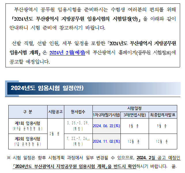 [[공고예정]]2024 부산시 지방공무원 임용시험 일정 안내 (9급: 6.22 / 7급: 11.2 / 2월중 공고예정) 작성자9꿈사운영위|작성시간23.12.29|조회수731 목록 댓글 0 글자크기 작게가 글자크기 크게가 다음검색 현재 게시글 추가 기능 열기 북마크 공유하기 신고 센터로 신고 댓글 댓글 0 댓글쓰기 답글쓰기 댓글 리스트