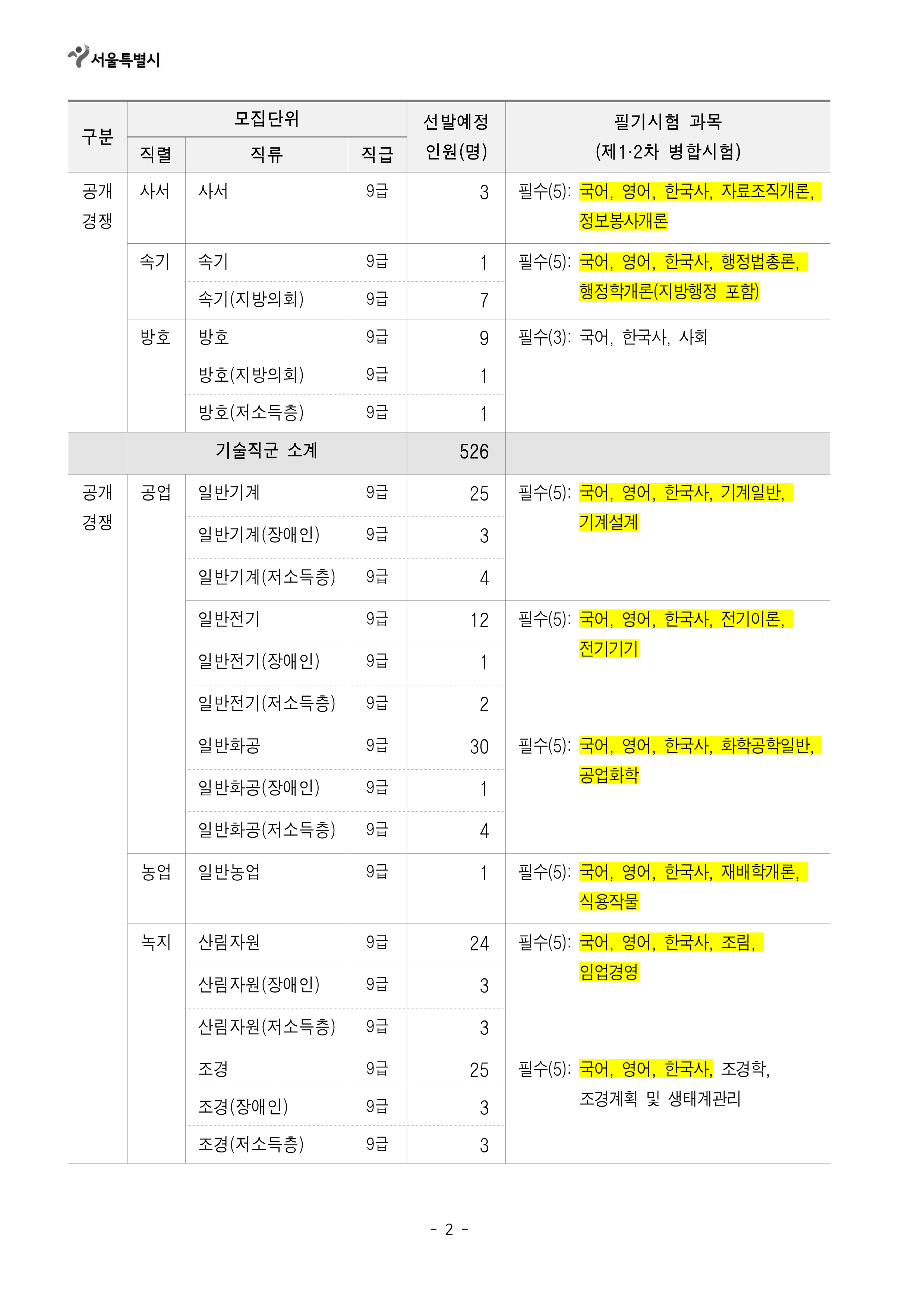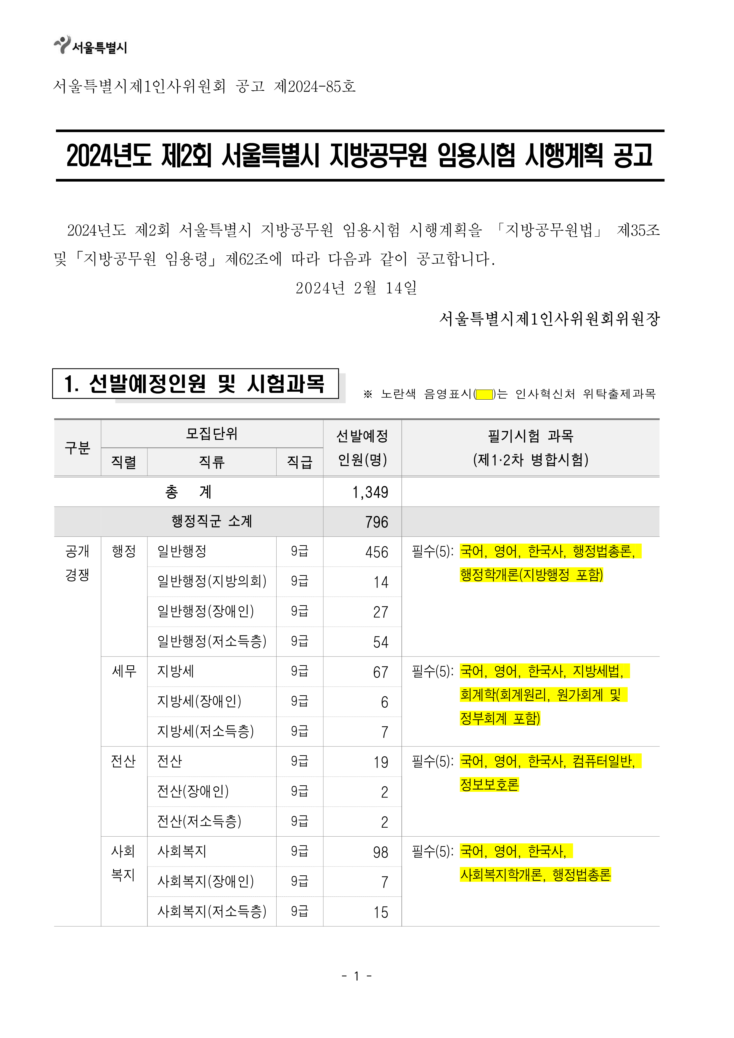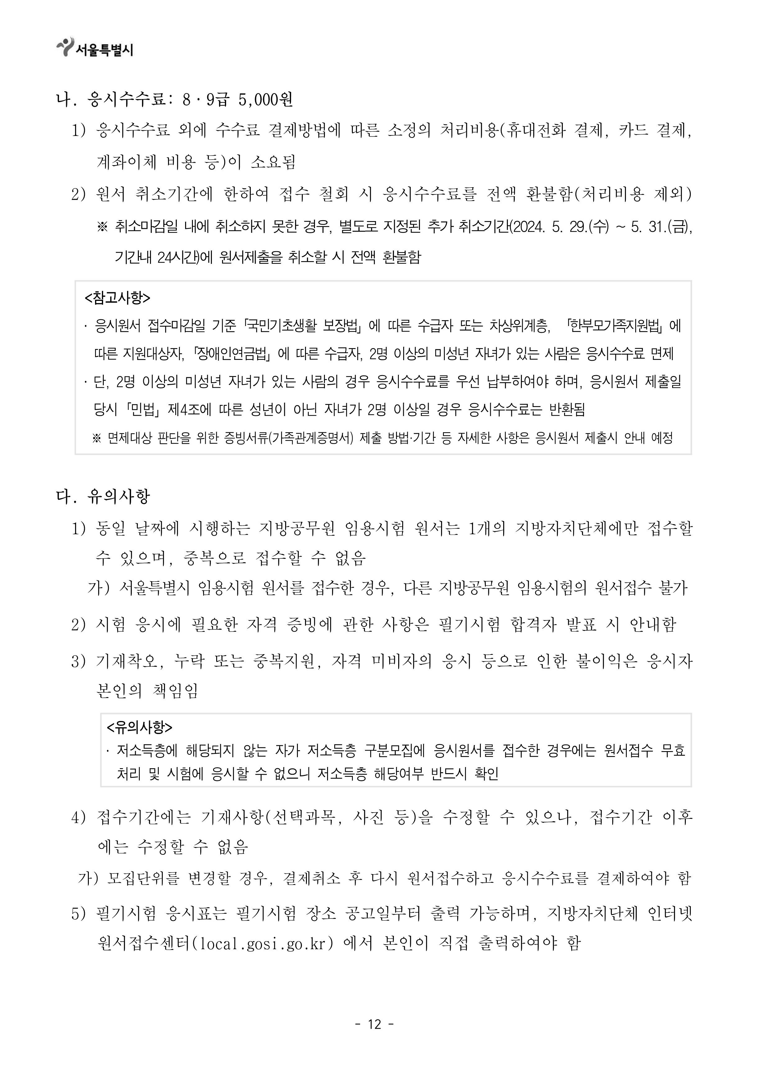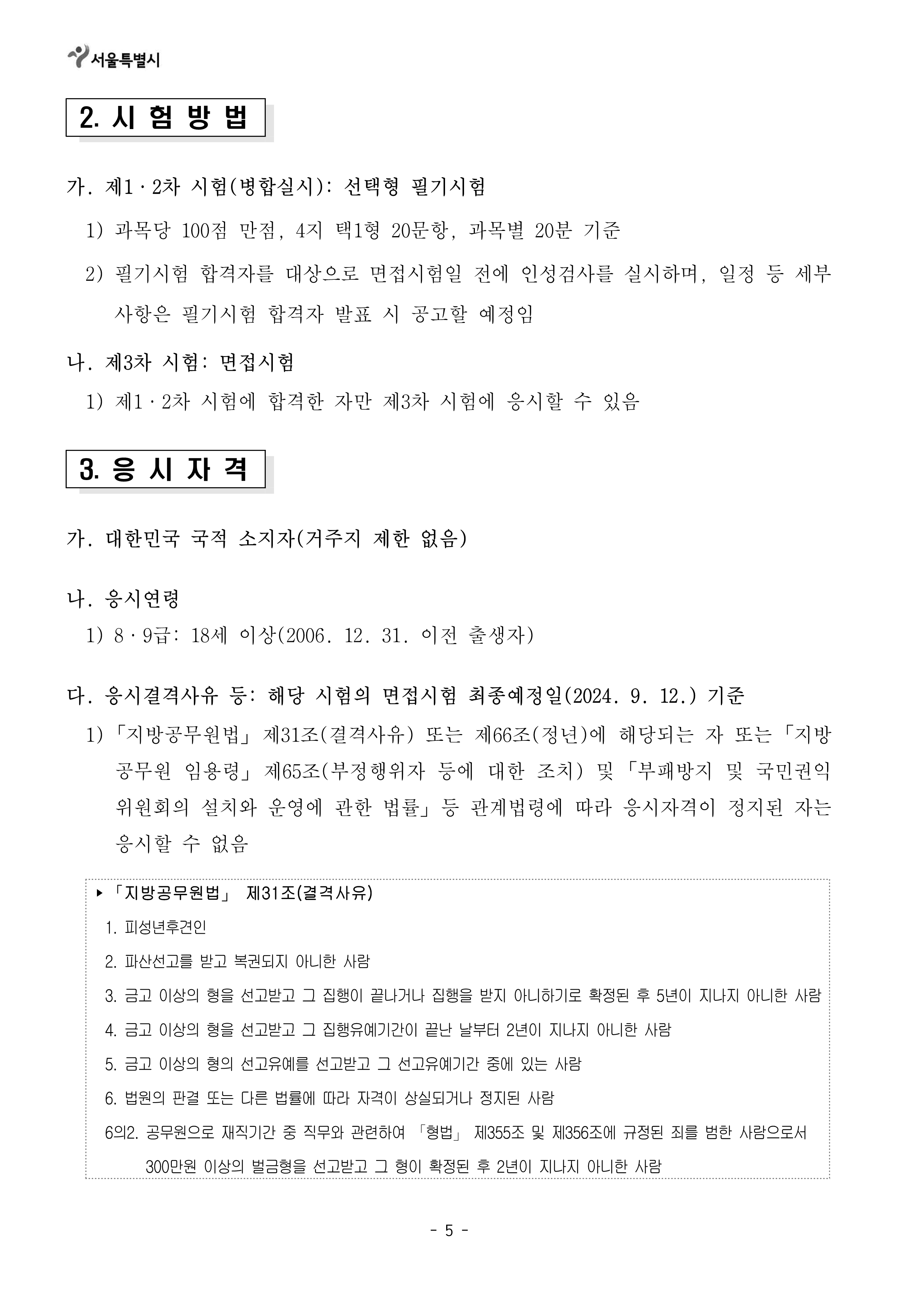[[시험공고]]2024 서울시 지방공무원(9급 등) 임용시험 공고 (9급접수: 3.25~29 / 9급시험: 6.22) 작성자9꿈사운영위|작성시간24.02.15|조회수7,462 목록 댓글 0 글자크기 작게가 글자크기 크게가 2024년도 제2회 서울특별시 지방공무원 임용시험 시행계획 공고.hwp141.00KB2. 2024년도부터 달라지는 시험제도.hwp160.00KB 첨부파일첨부된 파일이 19개 있습니다. png 파일 2024년도 제2회 서울특별시 지방공무원 임용시험 시행계획 공고_1.png 다운로드 png 파일 2024년도 제2회 서울특별시 지방공무원 임용시험 시행계획 공고_5.png 다운로드 png 파일 2024년도 제2회 서울특별시 지방공무원 임용시험 시행계획 공고_4.png 다운로드 png 파일 2024년도 제2회 서울특별시 지방공무원 임용시험 시행계획 공고_2.png 다운로드 png 파일 2024년도 제2회 서울특별시 지방공무원 임용시험 시행계획 공고_7.png 다운로드 png 파일 2024년도 제2회 서울특별시 지방공무원 임용시험 시행계획 공고_3.png 다운로드 png 파일 2024년도 제2회 서울특별시 지방공무원 임용시험 시행계획 공고_8.png 다운로드 png 파일 2024년도 제2회 서울특별시 지방공무원 임용시험 시행계획 공고_6.png 다운로드 png 파일 2024년도 제2회 서울특별시 지방공무원 임용시험 시행계획 공고_9.png 다운로드 png 파일 2024년도 제2회 서울특별시 지방공무원 임용시험 시행계획 공고_12.png 다운로드 png 파일 2024년도 제2회 서울특별시 지방공무원 임용시험 시행계획 공고_10.png 다운로드 png 파일 2024년도 제2회 서울특별시 지방공무원 임용시험 시행계획 공고_11.png 다운로드 png 파일 2024년도 제2회 서울특별시 지방공무원 임용시험 시행계획 공고_13.png 다운로드 png 파일 2024년도 제2회 서울특별시 지방공무원 임용시험 시행계획 공고_14.png 다운로드 png 파일 2024년도 제2회 서울특별시 지방공무원 임용시험 시행계획 공고_17.png 다운로드 png 파일 2024년도 제2회 서울특별시 지방공무원 임용시험 시행계획 공고_15.png 다운로드 png 파일 2024년도 제2회 서울특별시 지방공무원 임용시험 시행계획 공고_16.png 다운로드 hwp 파일 2024년도 제2회 서울특별시 지방공무원 임용시험 시행계획 공고.hwp 다운로드 hwp 파일 2. 2024년도부터 달라지는 시험제도.hwp 다운로드 다음검색 현재 게시글 추가 기능 열기 북마크 공유하기 신고 센터로 신고 댓글 댓글 0 댓글쓰기 답글쓰기 댓글 리스트