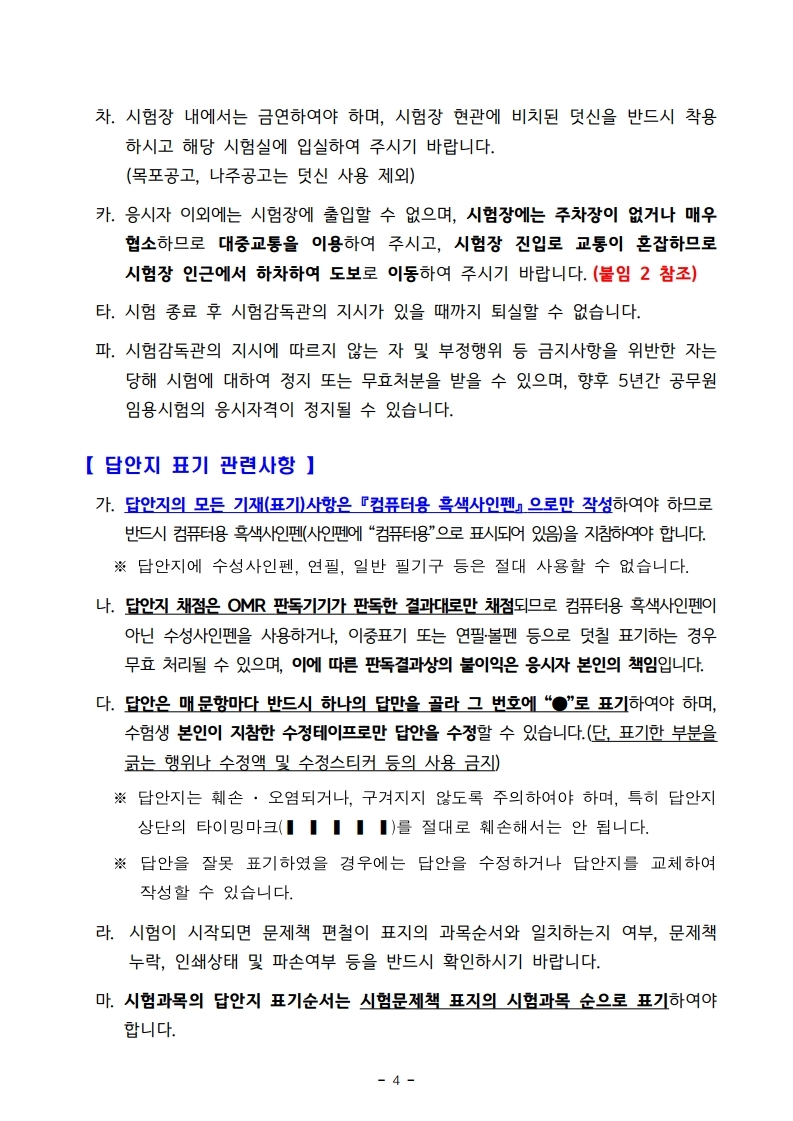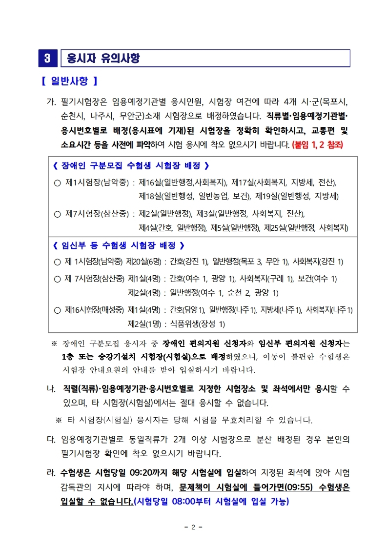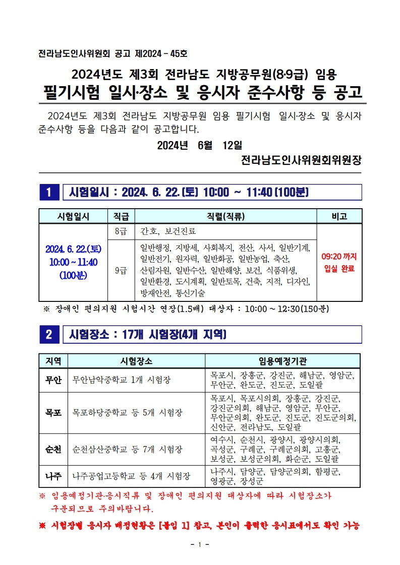 [[시험장소]]2024 전남 지방공무원(9급 등) 임용 필기시험 장소공고 (시험: 6.22) 작성자♡9꿈이♡|작성시간24.06.12|조회수780 목록 댓글 0 글자크기 작게가 글자크기 크게가 (공고문) 2024년도 제3회 전라남도 지방공무원 임용 필기시험 장소 공고.pdf386.90KB(붙임 1) 시험장별 응시자 배정현황.xlsx23.37KB[붙임 2] 필기시험장 위치도.pdf676.89KB[붙임 3] 필기시험 성적 사전 공개 안내.pdf73.07KB 첨부파일첨부된 파일이 12개 있습니다. jpg 파일 (공고문) 2024년도 제3회 전라남도 지방공무원 임용 필기시험 장소 공고.pdf_page_1.jpg 다운로드 jpg 파일 (공고문) 2024년도 제3회 전라남도 지방공무원 임용 필기시험 장소 공고.pdf_page_4.jpg 다운로드 jpg 파일 (공고문) 2024년도 제3회 전라남도 지방공무원 임용 필기시험 장소 공고.pdf_page_5.jpg 다운로드 jpg 파일 (공고문) 2024년도 제3회 전라남도 지방공무원 임용 필기시험 장소 공고.pdf_page_2.jpg 다운로드 jpg 파일 (공고문) 2024년도 제3회 전라남도 지방공무원 임용 필기시험 장소 공고.pdf_page_3.jpg 다운로드 jpg 파일 (공고문) 2024년도 제3회 전라남도 지방공무원 임용 필기시험 장소 공고.pdf_page_6.jpg 다운로드 jpg 파일 (공고문) 2024년도 제3회 전라남도 지방공무원 임용 필기시험 장소 공고.pdf_page_7.jpg 다운로드 png 파일 전남 시험장소.png 다운로드 pdf 파일 (공고문) 2024년도 제3회 전라남도 지방공무원 임용 필기시험 장소 공고.pdf 다운로드 pdf 파일 [붙임 2] 필기시험장 위치도.pdf 다운로드 xlsx 파일 (붙임 1) 시험장별 응시자 배정현황.xlsx 다운로드 pdf 파일 [붙임 3] 필기시험 성적 사전 공개 안내.pdf 다운로드 다음검색 현재 게시글 추가 기능 열기 북마크 공유하기 신고 센터로 신고 댓글 댓글 0 댓글쓰기 답글쓰기 댓글 리스트