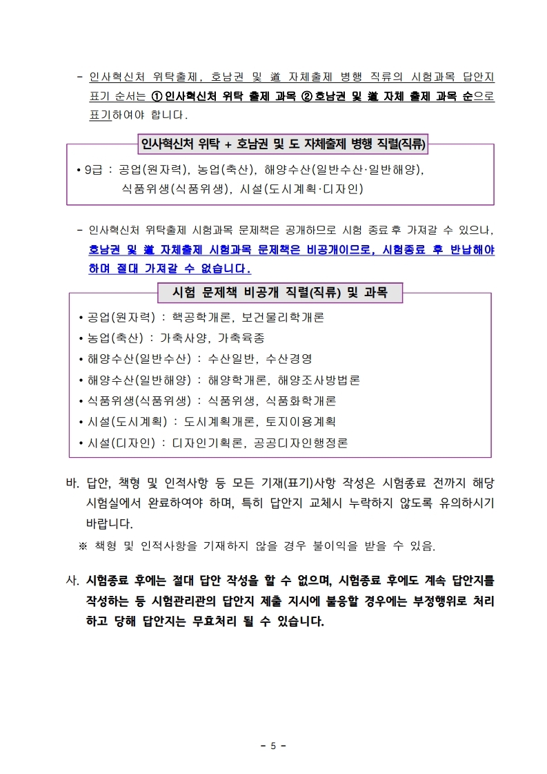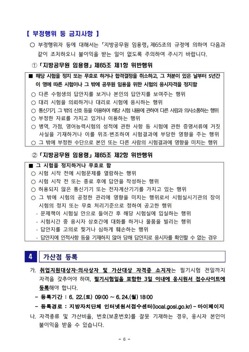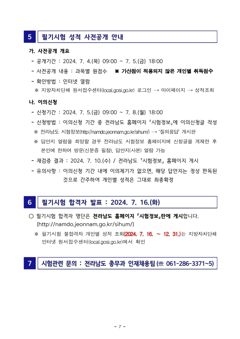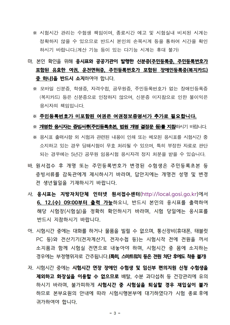[[시험장소]]2024 전남 지방공무원(9급 등) 임용 필기시험 장소공고 (시험: 6.22) 작성자♡9꿈이♡|작성시간24.06.12|조회수780 목록 댓글 0 글자크기 작게가 글자크기 크게가 (공고문) 2024년도 제3회 전라남도 지방공무원 임용 필기시험 장소 공고.pdf386.90KB(붙임 1) 시험장별 응시자 배정현황.xlsx23.37KB[붙임 2] 필기시험장 위치도.pdf676.89KB[붙임 3] 필기시험 성적 사전 공개 안내.pdf73.07KB 첨부파일첨부된 파일이 12개 있습니다. jpg 파일 (공고문) 2024년도 제3회 전라남도 지방공무원 임용 필기시험 장소 공고.pdf_page_1.jpg 다운로드 jpg 파일 (공고문) 2024년도 제3회 전라남도 지방공무원 임용 필기시험 장소 공고.pdf_page_4.jpg 다운로드 jpg 파일 (공고문) 2024년도 제3회 전라남도 지방공무원 임용 필기시험 장소 공고.pdf_page_5.jpg 다운로드 jpg 파일 (공고문) 2024년도 제3회 전라남도 지방공무원 임용 필기시험 장소 공고.pdf_page_2.jpg 다운로드 jpg 파일 (공고문) 2024년도 제3회 전라남도 지방공무원 임용 필기시험 장소 공고.pdf_page_3.jpg 다운로드 jpg 파일 (공고문) 2024년도 제3회 전라남도 지방공무원 임용 필기시험 장소 공고.pdf_page_6.jpg 다운로드 jpg 파일 (공고문) 2024년도 제3회 전라남도 지방공무원 임용 필기시험 장소 공고.pdf_page_7.jpg 다운로드 png 파일 전남 시험장소.png 다운로드 pdf 파일 (공고문) 2024년도 제3회 전라남도 지방공무원 임용 필기시험 장소 공고.pdf 다운로드 pdf 파일 [붙임 2] 필기시험장 위치도.pdf 다운로드 xlsx 파일 (붙임 1) 시험장별 응시자 배정현황.xlsx 다운로드 pdf 파일 [붙임 3] 필기시험 성적 사전 공개 안내.pdf 다운로드 다음검색 현재 게시글 추가 기능 열기 북마크 공유하기 신고 센터로 신고 댓글 댓글 0 댓글쓰기 답글쓰기 댓글 리스트