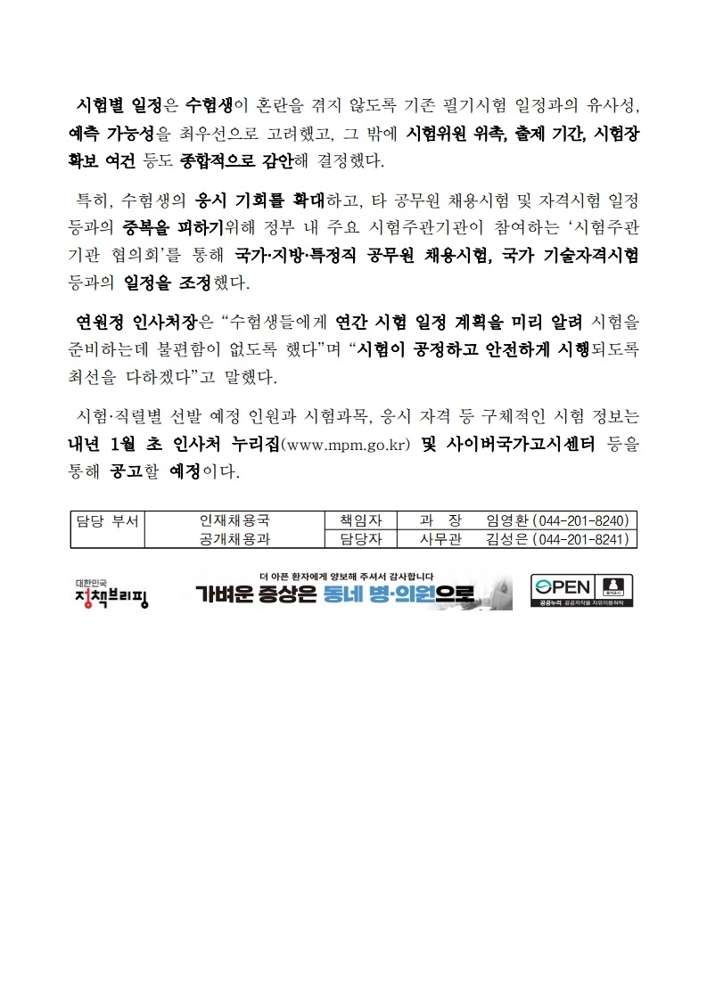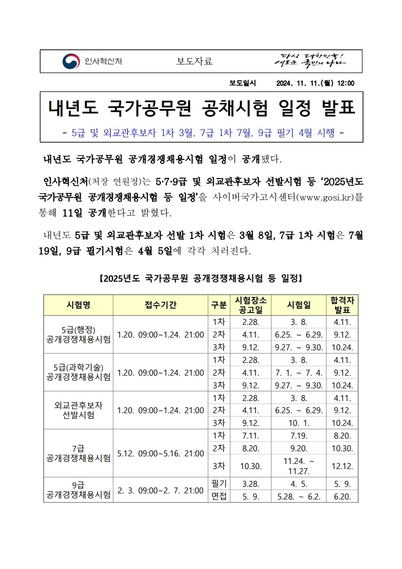 [[필수정보]]2025 인사혁신처 국가직 7,9급 공무원 공채시험 일정 공고 (9급: 4.5 / 7급 1차: 7.19 / 7급 2차: 9.20) 작성자9꿈사운영위|작성시간24.11.18|조회수3,307 목록 댓글 0 글자크기 작게가 글자크기 크게가 다음검색 현재 게시글 추가 기능 열기 북마크 공유하기 신고 센터로 신고 댓글 댓글 0 댓글쓰기 답글쓰기 댓글 리스트