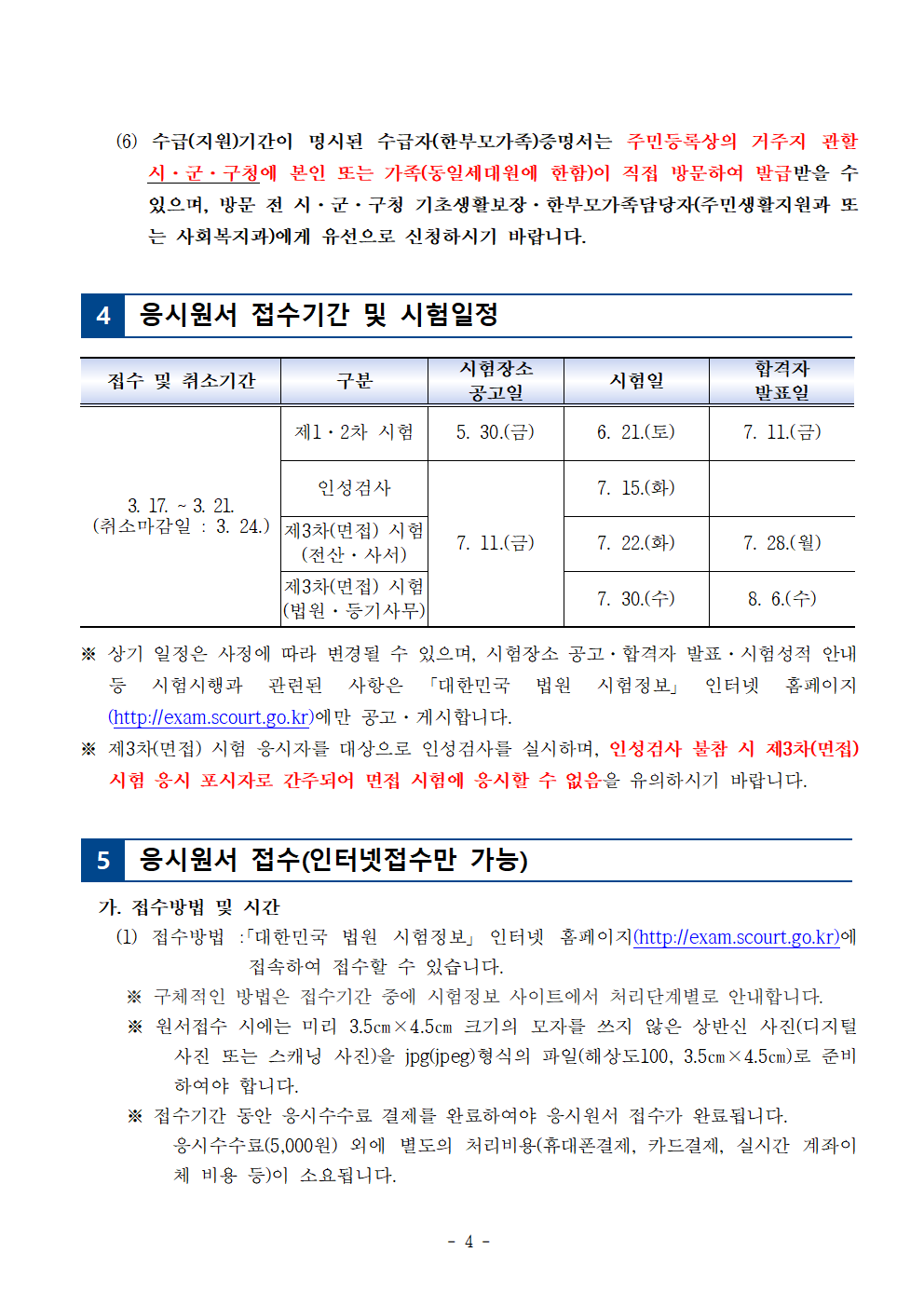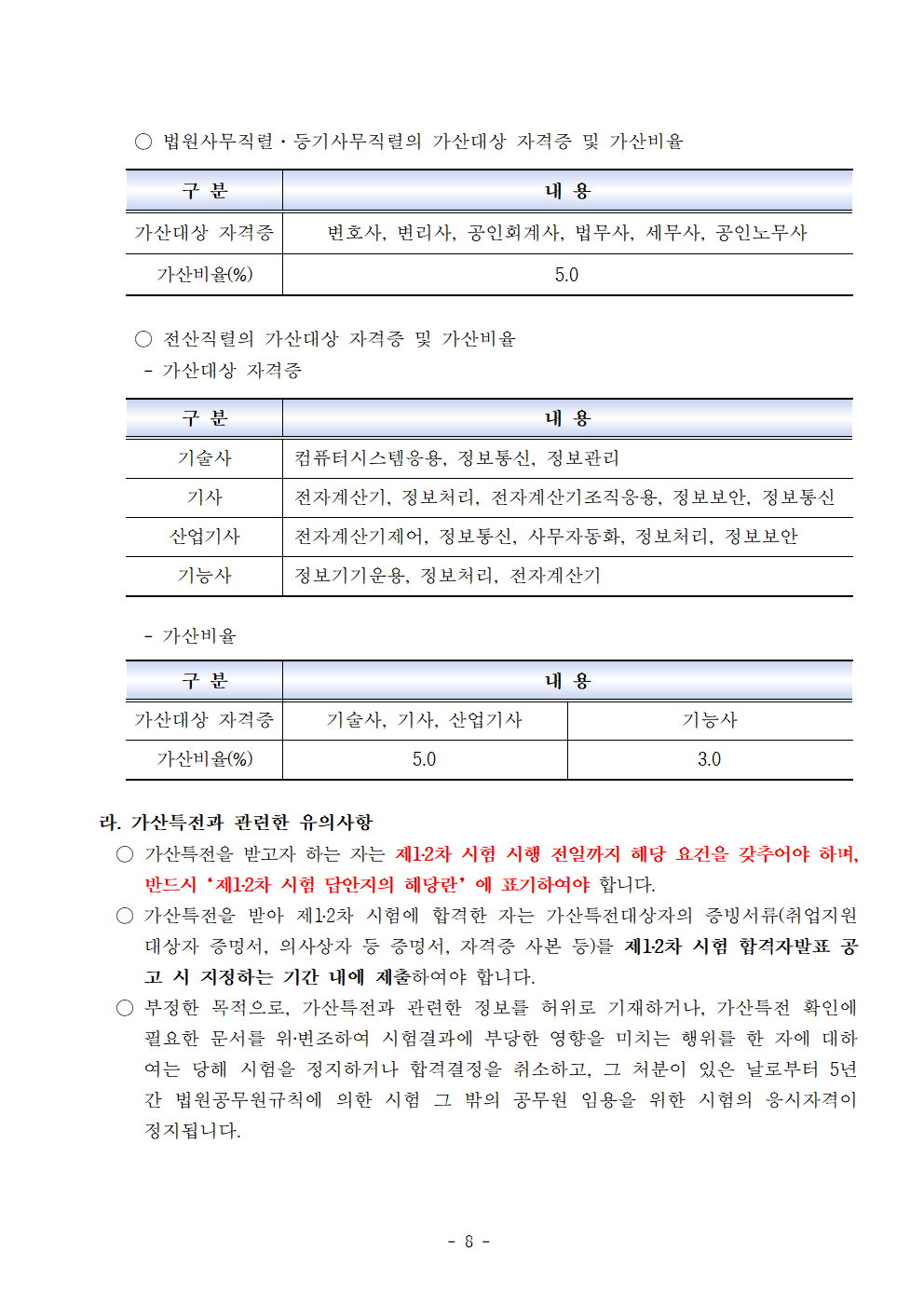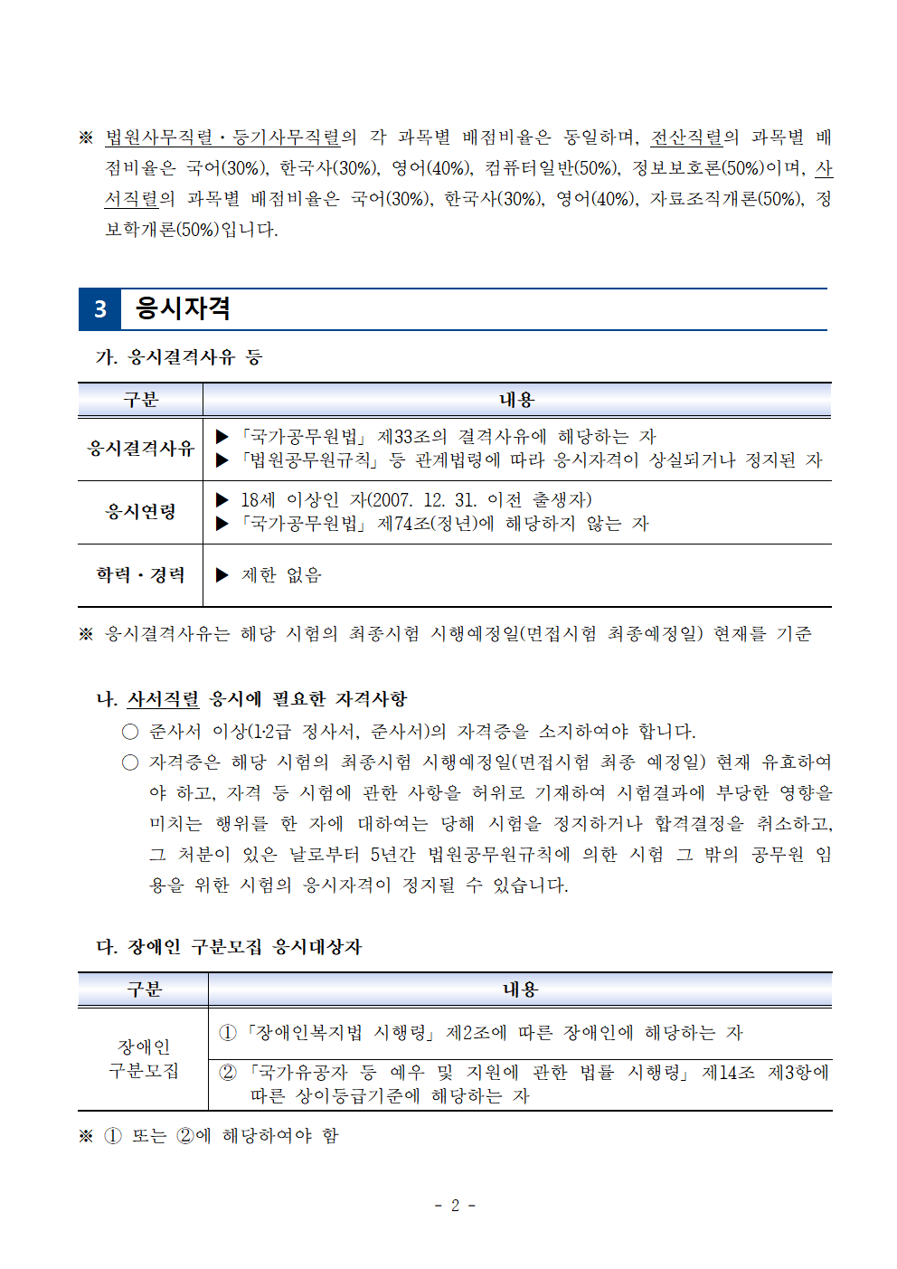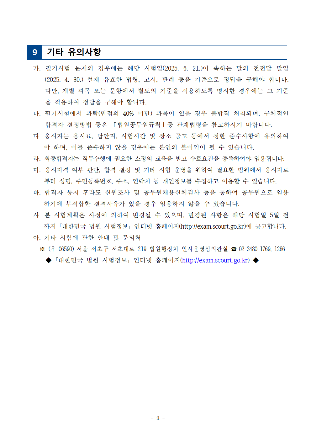 [[시험공고]]2025 법원행정처 법원직 9급 공무원 공채시험 공고 (접수: 3.17~21 / 시험: 6.21 / 3월중 선발인원 공고예정) 작성자9꿈사운영위|작성시간25.01.03|조회수2,008 목록 댓글 0 글자크기 작게가 글자크기 크게가 2025년도 9급 공개경쟁채용시험 시행계획 공고.hwp33.50KB 첨부파일첨부된 파일이 10개 있습니다. png 파일 법원직 시험일정003.png 다운로드 png 파일 법원직 시험일정005.png 다운로드 png 파일 법원직 시험일정001.png 다운로드 png 파일 법원직 시험일정006.png 다운로드 png 파일 법원직 시험일정002.png 다운로드 png 파일 법원직 시험일정004.png 다운로드 png 파일 법원직 시험일정009.png 다운로드 png 파일 법원직 시험일정008.png 다운로드 png 파일 법원직 시험일정007.png 다운로드 hwp 파일 2025년도 9급 공개경쟁채용시험 시행계획 공고.hwp 다운로드 다음검색 현재 게시글 추가 기능 열기 북마크 공유하기 신고 센터로 신고 댓글 댓글 0 댓글쓰기 답글쓰기 댓글 리스트