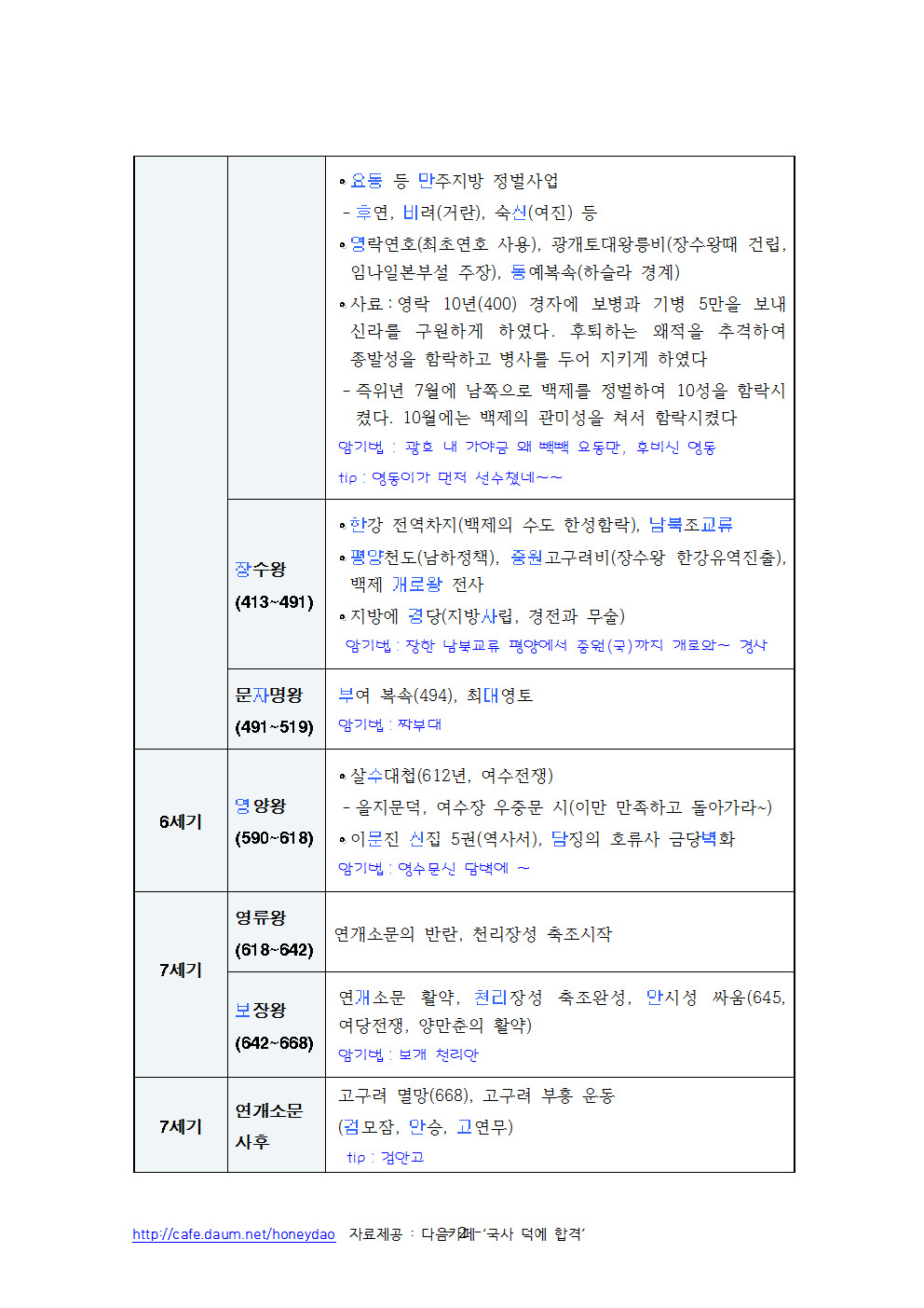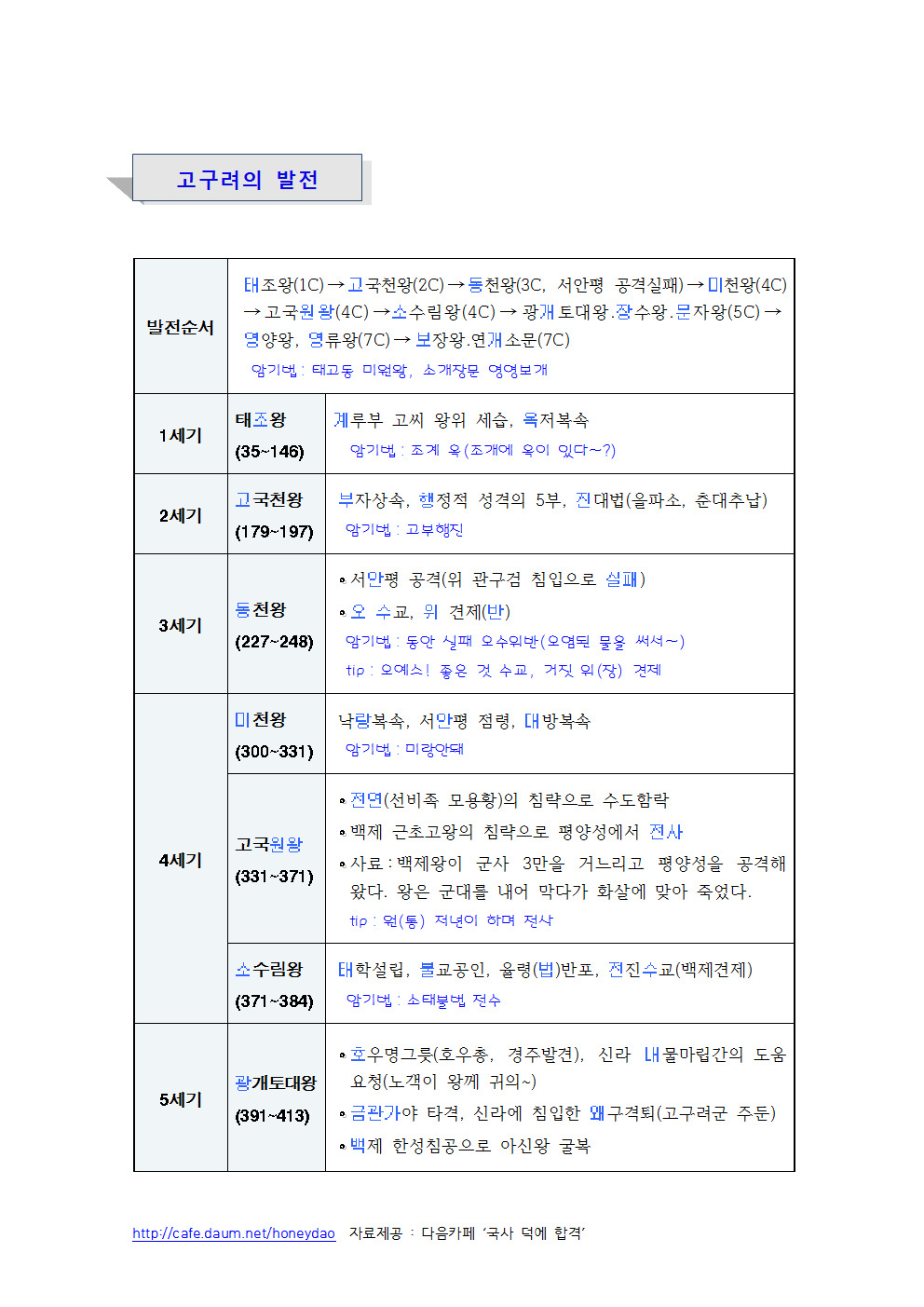고구려, 백제, 신라왕의 업적 정리 및 암기법(아주 좋아요~) 작성자하gkgk|작성시간13.12.09|조회수1,075 목록 댓글 0 글자크기 작게가 글자크기 크게가 백제, 신라, 그리고 삼국사기 삼국유사 왕구분법은 아래쪽 '각 과목 요약정리' 카테고리에 있습니다. 출력 하셔서 암기하심 아주 좋습니다~~ 첨부파일첨부된 파일이 4개 있습니다. jpg 파일 고구려 발전001.jpg 다운로드 jpg 파일 고구려 발전002.jpg 다운로드 bmp 파일 고구려 발전001.bmp 다운로드 bmp 파일 고구려 발전002.bmp 다운로드 다음검색 현재 게시글 추가 기능 열기 북마크 공유하기 신고 센터로 신고 댓글 댓글 0 댓글쓰기 답글쓰기 댓글 리스트