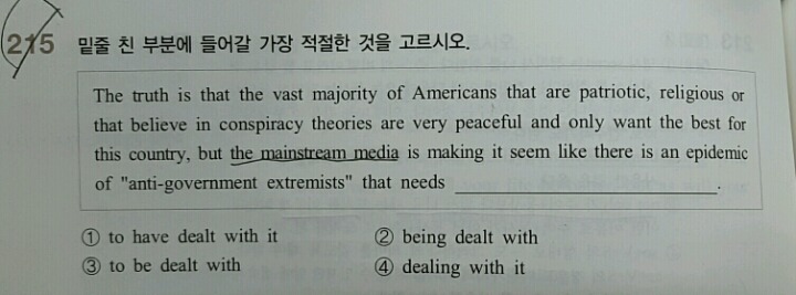 [[문법문제]]수동 작성자소리초롱|작성시간17.05.09|조회수71 목록 댓글 2 글자크기 작게가 글자크기 크게가 p170답3번.need는 수동이면 동명사 or to be pp인건데요.저기서 왜 수동으로 보나요?'확산현상이 해결해야 할' 그러면 능동같기도 해서요 다음검색 현재 게시글 추가 기능 열기 북마크 공유하기 신고 센터로 신고 댓글 댓글 2 댓글쓰기 답글쓰기 댓글 리스트 작성자bestdriver | 작성시간 17.05.09 반정부 극단주의자들의 퍼짐현상이 처리되어야 할 필요가 있는것처럼 주류언론이 만드는것 같다 답댓글 작성자소리초롱 작성자 본인 여부 작성자 | 작성시간 17.05.09 감사합니다 댓글 전체보기