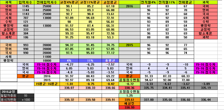 작년 대비 16년 교정 공통 과목 평균은 상위4% -1.01점, 상위11% -0.75점, 전체평균은 -0.42점이고