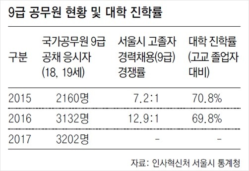 2015년부터 올해 2017년까지 국가공무원 9급 공채 응시자(18,19세)가 2160명에서 3202명으로 크게 늘었으며