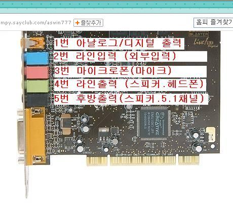사운드 카드를 보면 잭을 꼽는 구멍이 5개 보이게 됩니다