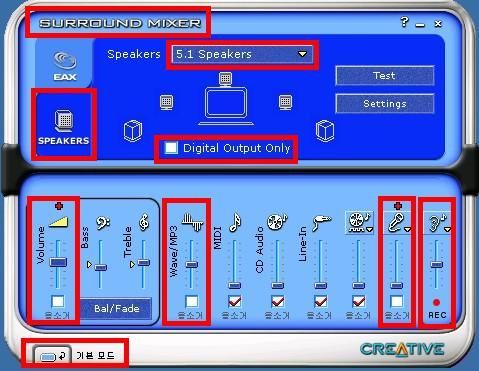 밑에 나온    믹서 그림중에 기본모드로  위에  eax 하고 speakers라고 보이게 됩니다  그림에서  클릭하시면 위에  digital  output only 라고  빈칸이 보이는데    체크가 되있다면 소리가 안나옵니다    위에 스피커는  5.1체널로 선택했음 ★★ 체크지우세요,★★,