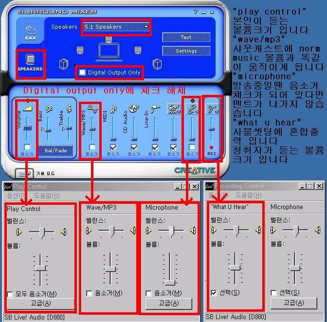 그리고 녹음에 있는 혼합출력부분 1개만 뜨는거요, 거기볼륨이 가장 중요하죠 일단 혼합 출력이( 스테레오 믹스) 라고 했을때 선택에 체크하시고 위에서 말한 것처럼 그 조절이 방송에 잡음도 줄일수가 있음니다 저같은 사블 라이브 5.1기종쓰시는분이라면 what u hear 체크하시고 50% 정도 하세여 따라 하지 않으셔도 무방 합니다 제가 설정했을때 사운드에 에코가 들어가있는데 50%정도로 방송하고 있음니다 듣는분들 음질 쥑인다고 합니다 그리고 볼륨 콘트롤에 있는 웨이브나 마이크는 조절을 할필요가 없다고 보시면 됩니다 왜냐 방송할꺼라면 샤웃캐스트에 어드밴스 모드 설정하는곳에서 님들이 정한 볼륨 레벨이 마이크 나 웨이브에 바로 작동이 되기 때문이죠,,