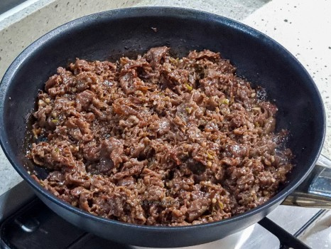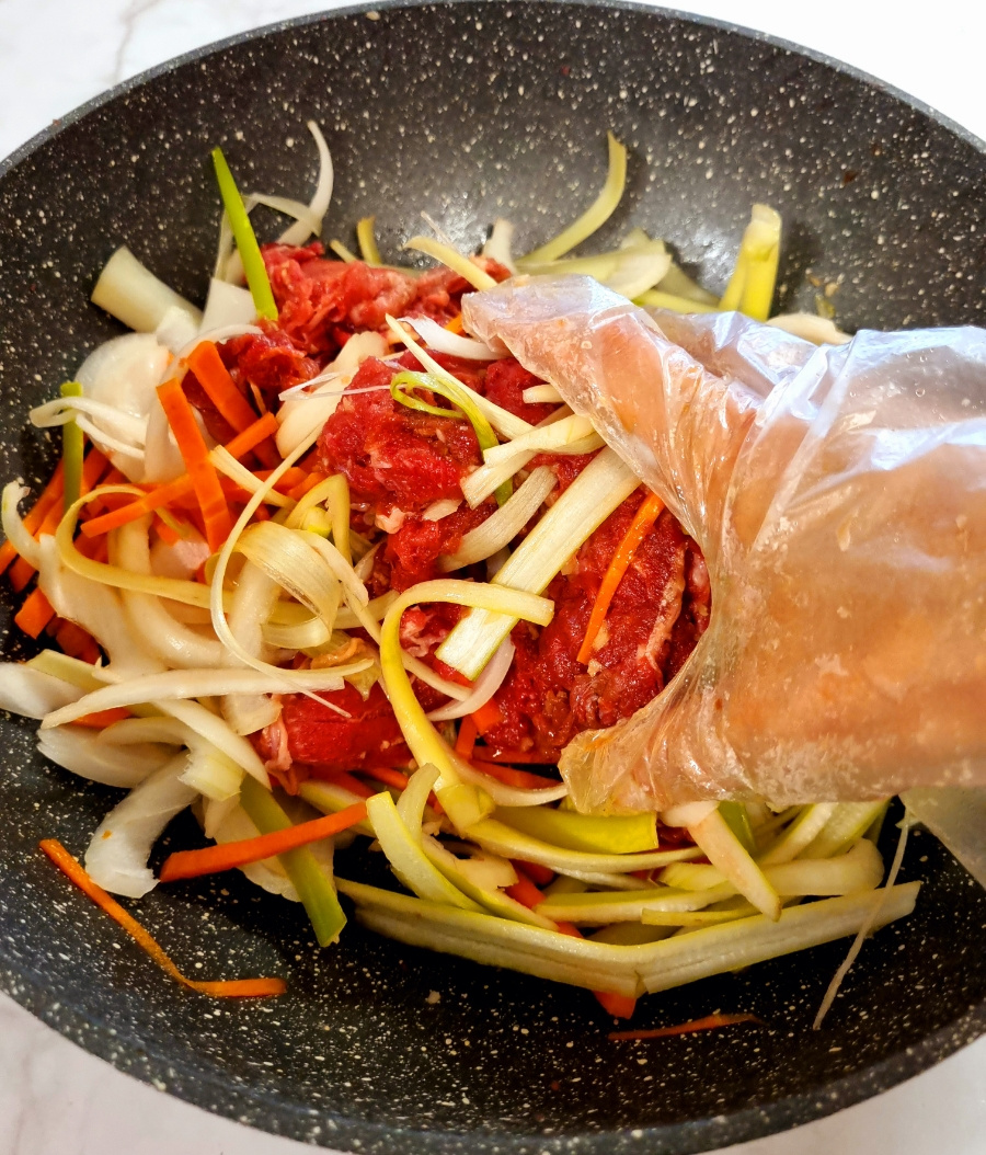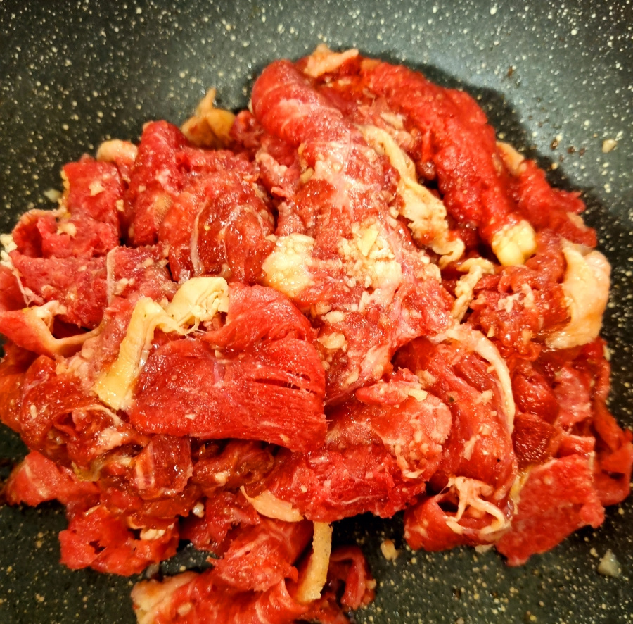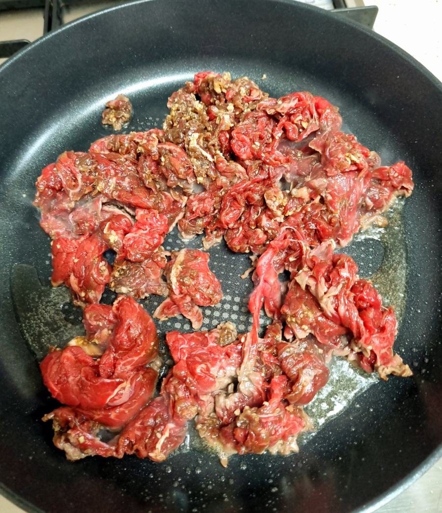 5. 프라이팬에 열이 오르면 재워 놓았던 소고기를 넣고 볶아주세요. 기름을 두르지 않아도 양념이 밴 고기가 촉촉하기 때문에 기름 없이볶아준다.