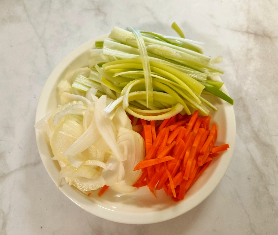 4. 고기에 양념이 재워질 동안, 대파는 길쭉길쭉하게 썰고, 양파와 당근은 채로 썰어 준다.