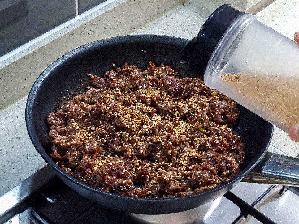 4. 잘 구워진 소불고기에다 통깨를 솔솔 뿌려 마무리한다.