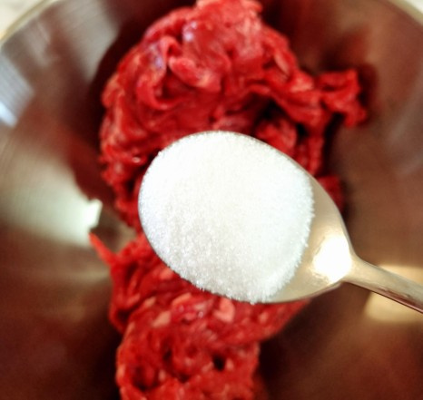 2. 연육 작용 질긴 맛을 부드럽게 해주기 위해 설탕 1T를 넣고 소고기를 조물조물 주물러 소고기의 육질을 부드럽게 해 준다.