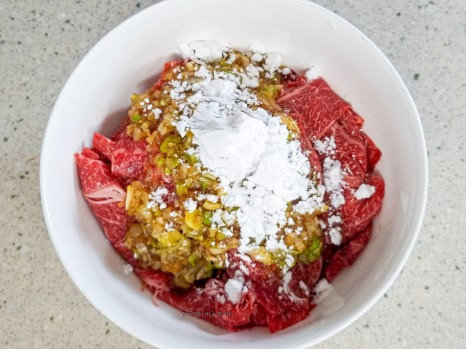 2. 볼에 소불고기 500g을 담고 양념 재료인 ▶ 설탕 2, 대파 3, 다진 마늘 1, 진간장 3, 맛술 2, 참기름ㆍ감자 전분 1T씩을 넣고 양념이 골고루 흡수 되도록 조물조물 버무린다.