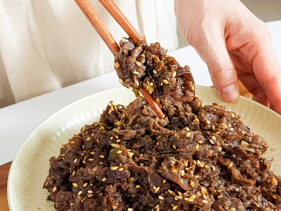 Tip 냉동 소고기지만 고기 냄새가 전혀 안 나고 양념도 너무 잘 베어 있으면 무조건 감탄하게 되는 간장불고기. 짭조름하면서 달달한 맛이 잘 어우러져 입안 가득 퍼지는 단짠단짠 소불고기 양념으로 복날 삼계탕 대신 몸모신해드 좋다.