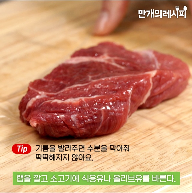 3. 랩을 깔고 소고기에 식용유나 올리브유를 바른다 Tip 기름을 발라주면 수분을 막아줘 딱딱해지지 않는다