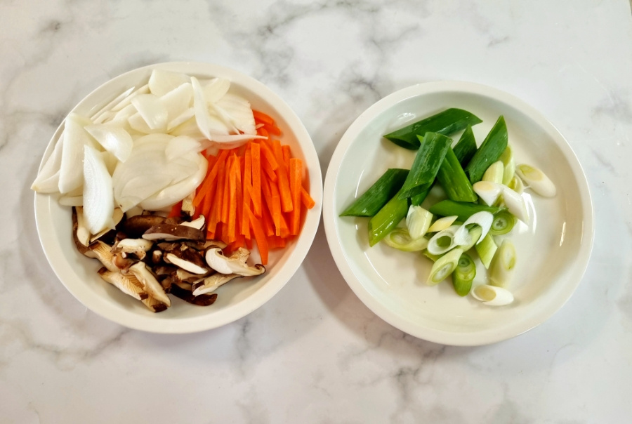 4. 표고버섯은 젖은 키친타월로 먼지를 털어내고 밑동을 제거한 뒤 썰어주세요. 양파와 당근은 채 썰어 주세요. 대파는 어슷 썬다. 소불고기에 볶아줄 채소들은 일정한 크기로 썬다.