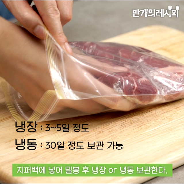 4. 손질한 소고기를 랩으로 싸서 냉장 or 냉동 보관한다. Tip 냉장은 3~5일 정도, 냉동은 30일 정도 보관 가능하다. 냉동 소고기를 사용할 뇨 하루 전날 냉장실로 옮겨 해동시켜준다.