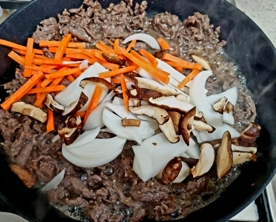 재료 : 소고기불고기용 500g, 양파 1개, 당근 1/3개, 표고버섯 4개, 대파 1대,