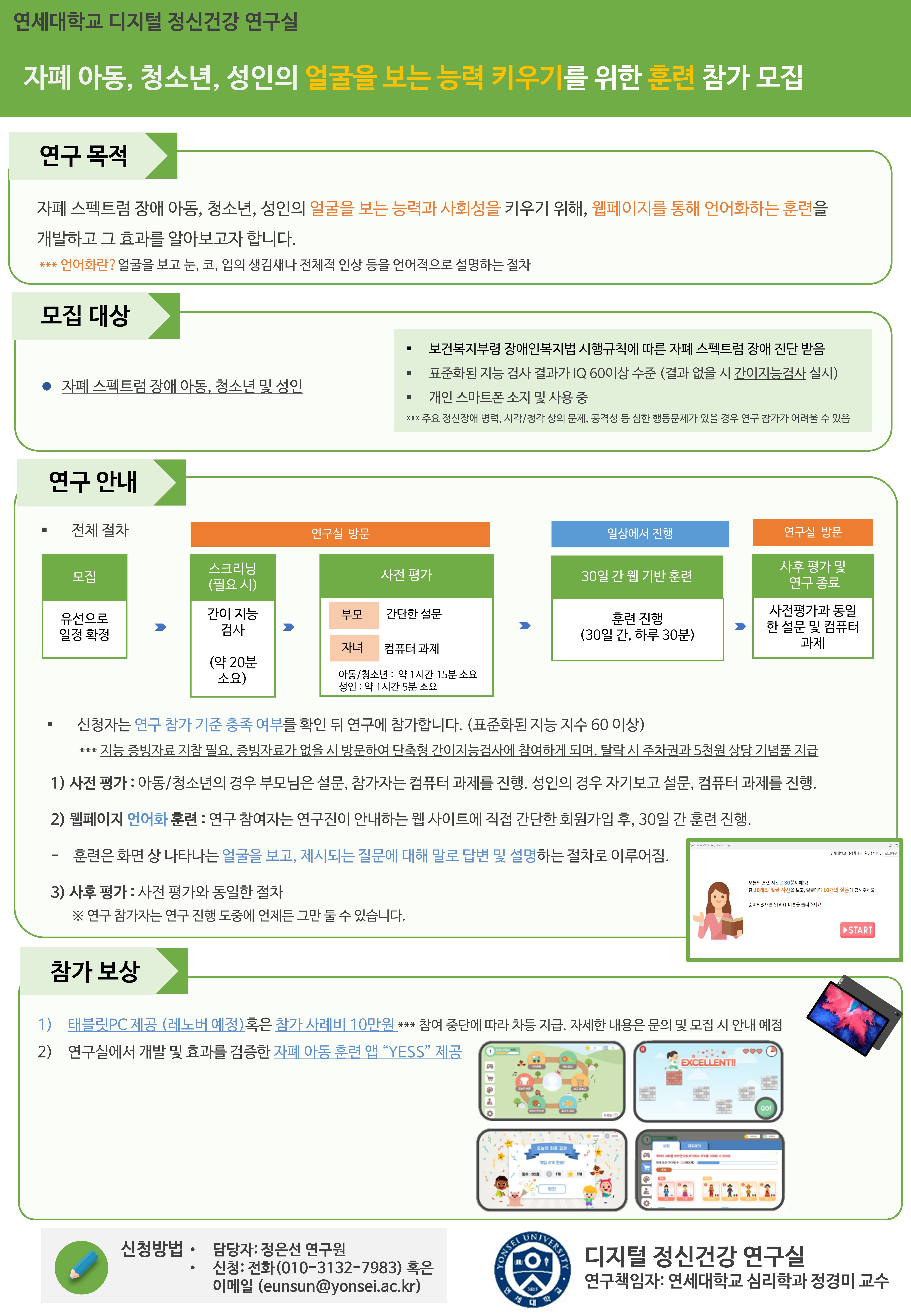 | 1. 연구 참가자 : 자폐 스펙트럼 장애 진단을 받은 아동, 청소년, 성인 (지능검사 지수 60 이상, 지능검사 결과가 없을 시 연구실에서 약식으로 진행) 2. 연구 절차 : 1) 연세대학교에 방문 및 사전 평가 진행 (약 1시간 소요) 2) 집에서 30일 간 웹페이지로 훈련 진행 (하루 약 2-30분 소요) 3) 연세대학교에 재방문 및 연구 종료 3. 연구 참가 보상 1) 10만원 사례비 혹은 태블릿 PC 제공 2) 전두엽 인지기능 훈련 어플리케이션 ‘YESS’ 무료이용권 제공 |