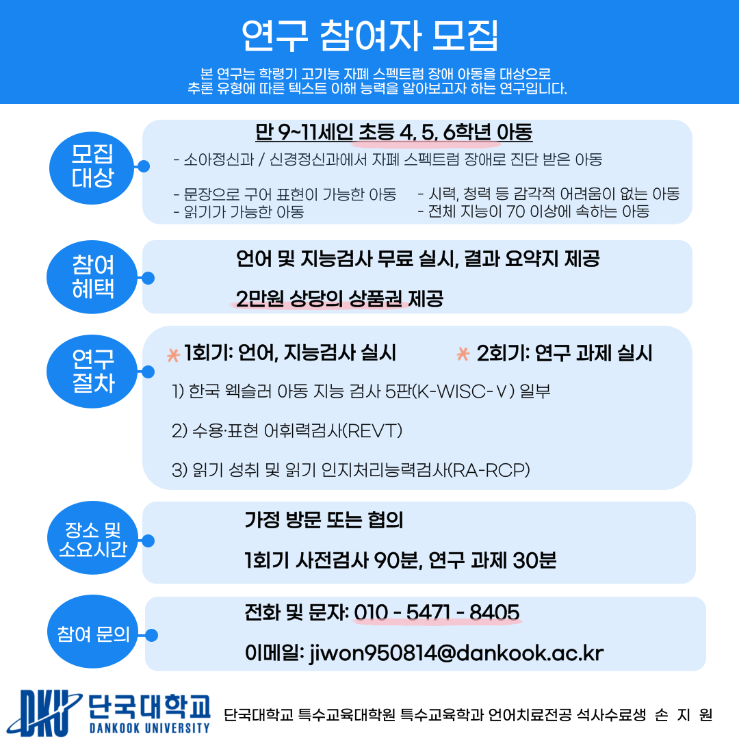 석사 논문으로 ‘학령기 고기능 자폐 스펙트럼 장애 아동의 추론 유형에 따른 텍스트 이해’에 대한 연구를 위해 초등학교 4, 5, 6학년 고기능 자폐 스펙트럼 장애 아동을 모집하고 있습니다. 본 논문을 통해 고기능 자폐 스펙트럼 장애 아동의 텍스트 이해를 돕는 추론 능력 중재의 단계적 접근의 필요성을 제시할 수 있을 것이라 기대하고 있습니다.