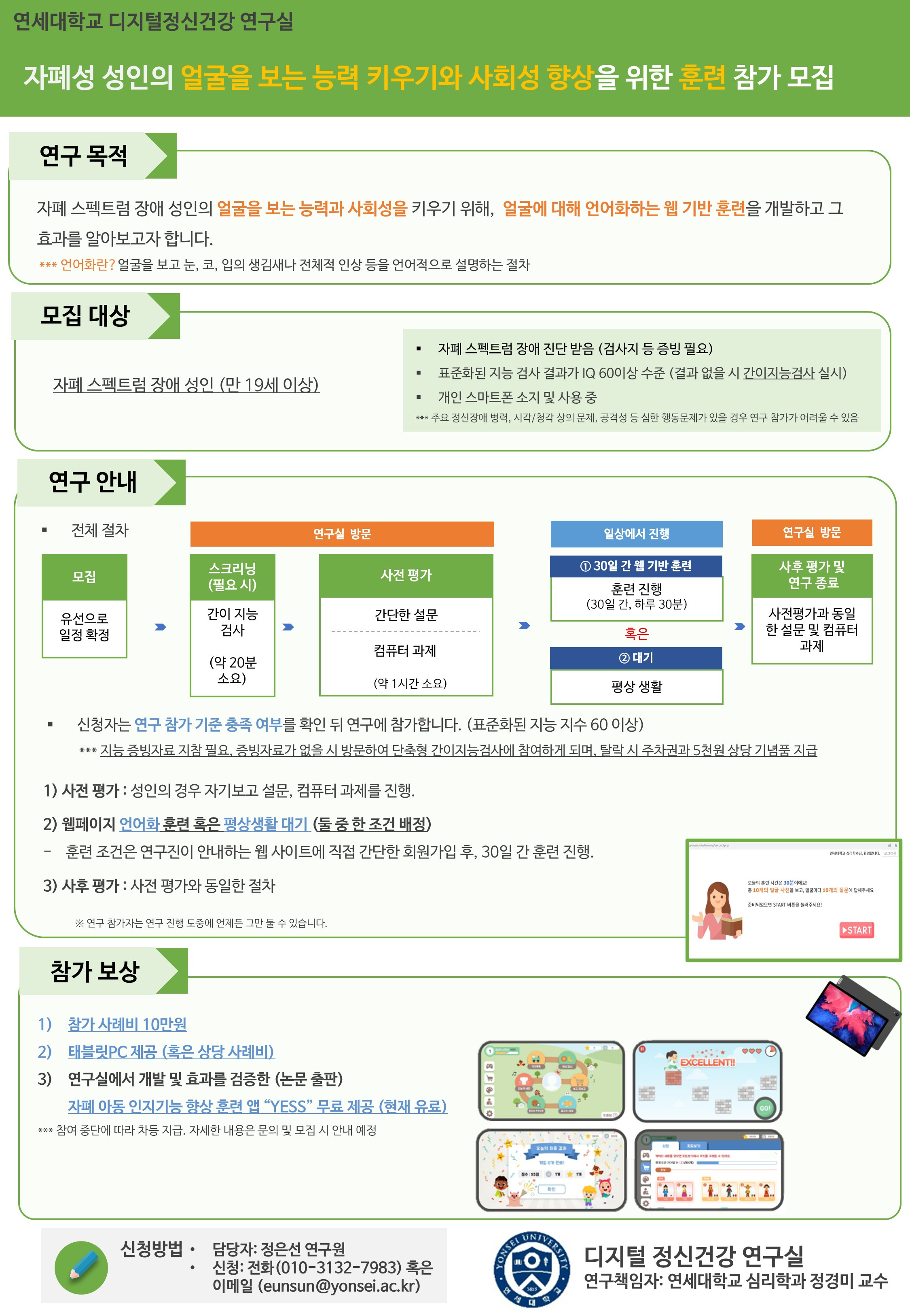 | 1. 연구 참가자 : 자폐 스펙트럼 장애 진단을 받은 성인 (지능검사 지수 60 이상, 지능검사 결과가 없을 시 연구실에서 약식으로 진행) 2. 연구 절차 : 1) 연세대학교에 방문 및 사전 평가 진행 (약 1시간 소요) 2) ①집에서 30일 간 웹페이지로 훈련 진행 (하루 약 2-30분 소요) 혹은 ②평상생활하며 대기 (두 조건 중 랜덤으로 배정) 3) 연세대학교에 재방문 및 연구 종료 3. 연구 참가 보상 1) 태블릿(혹은 상당 사례비) 및 10만원 사례비 2) 전두엽 인지기능 훈련 어플리케이션 ‘YESS’ (논문 출판 후 유료 상용화) 무료이용권 제공 |