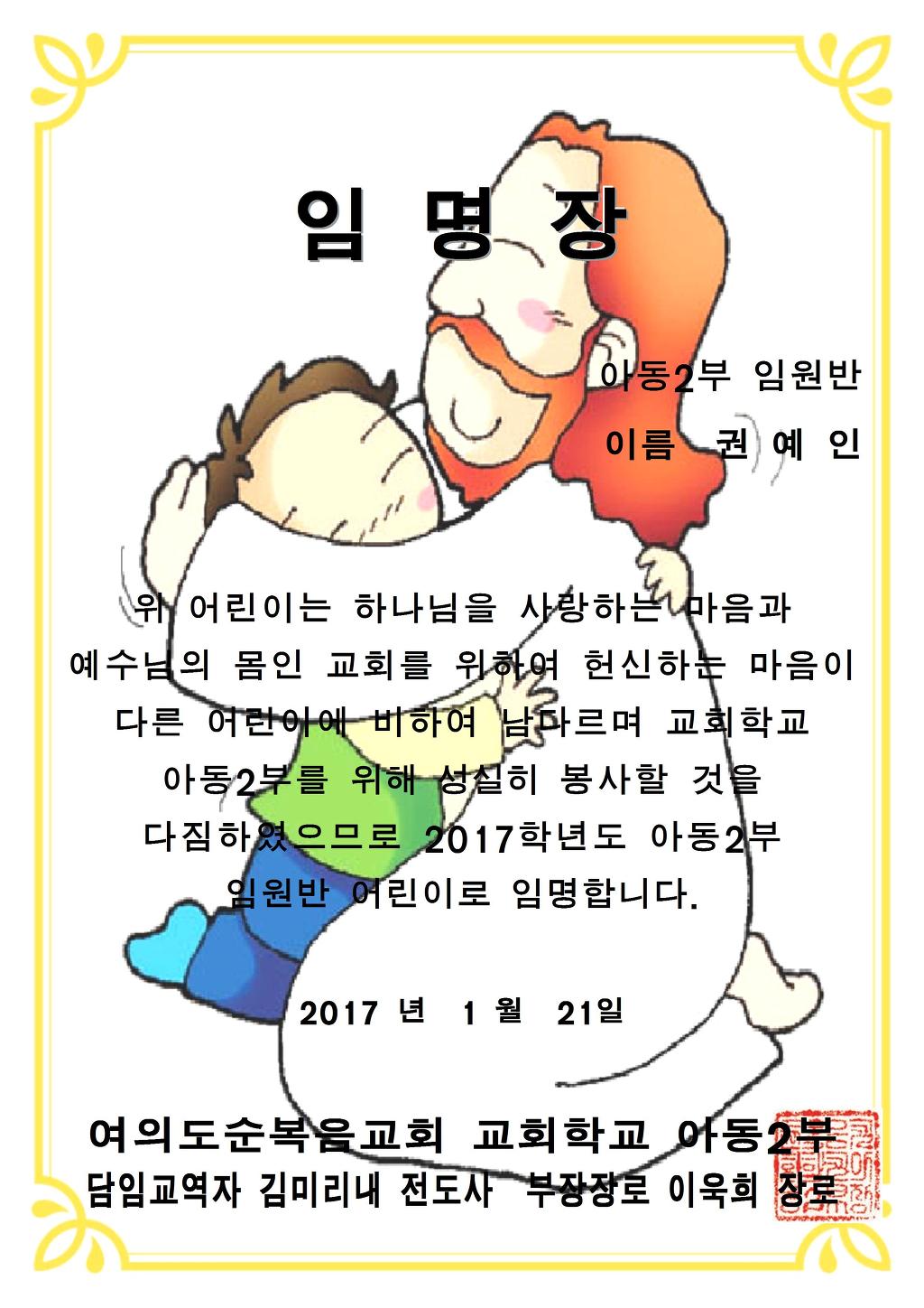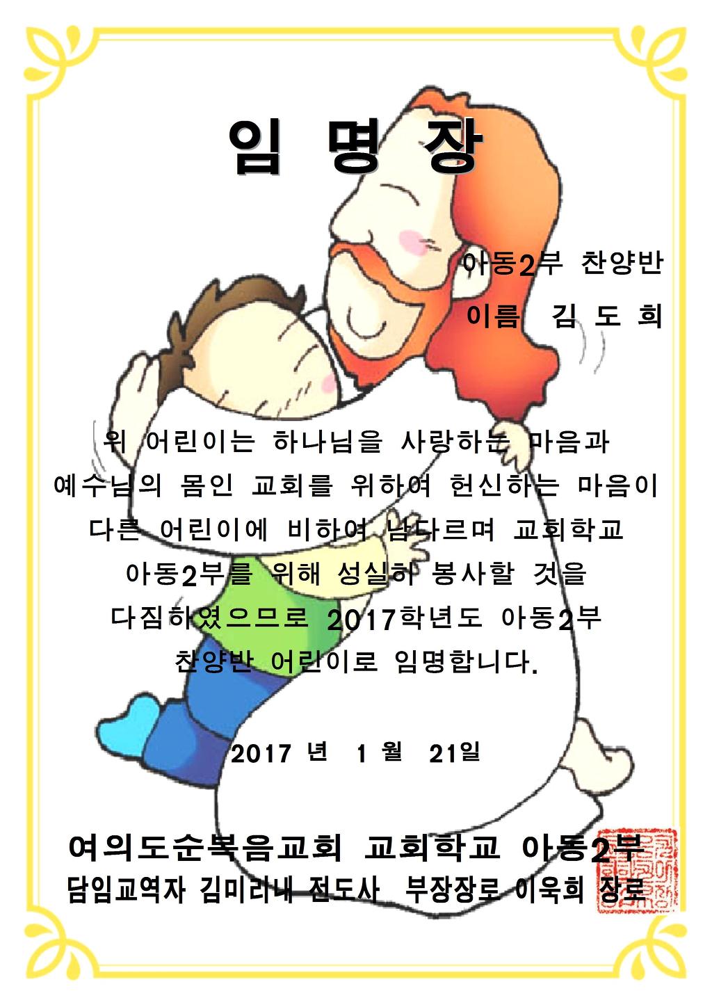 헌신반 2017 임명장 작성자정승윤|작성시간17.01.18|조회수28 목록 댓글 0 글자크기 작게가 글자크기 크게가 임원 찬양반 임명장 원본 2017.hwp 첨부파일첨부된 파일이 3개 있습니다. jpg 파일 image002.jpg 다운로드 jpg 파일 image001.jpg 다운로드 hwp 파일 임원 찬양반 임명장 원본 2017.hwp 다운로드 다음검색 현재 게시글 추가 기능 열기 북마크 공유하기 신고 센터로 신고 댓글 댓글 0 댓글쓰기 답글쓰기 댓글 리스트