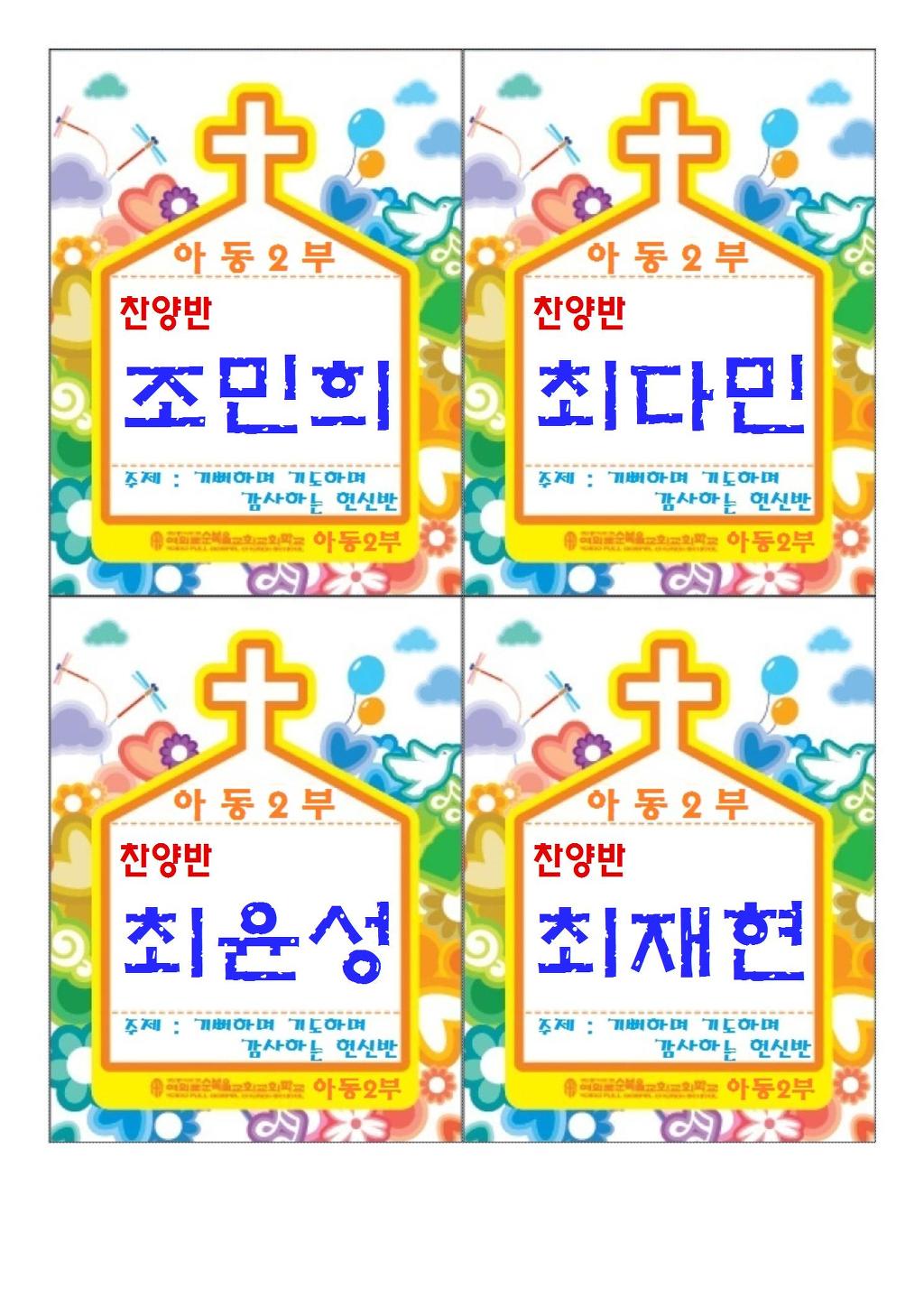 2015년도 찬양반 임시 명찰 작성자정승윤|작성시간14.12.22|조회수34 목록 댓글 0 글자크기 작게가 글자크기 크게가 초등2부 찬양반 명찰 2015.hwp 첨부파일첨부된 파일이 2개 있습니다. jpg 파일 image001.jpg 다운로드 hwp 파일 초등2부 찬양반 명찰 2015.hwp 다운로드 다음검색 현재 게시글 추가 기능 열기 북마크 공유하기 신고 센터로 신고 댓글 댓글 0 댓글쓰기 답글쓰기 댓글 리스트