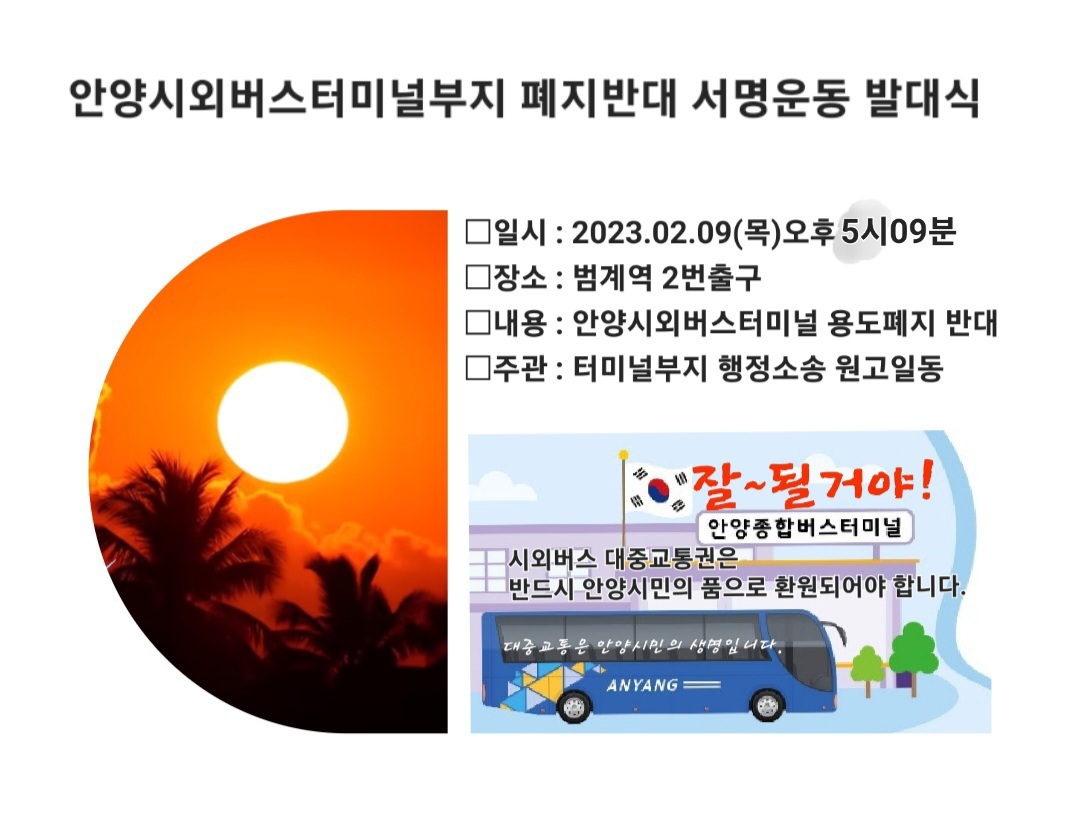 안양에 시외버스터미널이 없는 낡은 시대는 갔습니다. 우리 안양에도 우리들의 연대서명에 의하여 대중교통의 새로운 시대가 다가오고 있습니다.