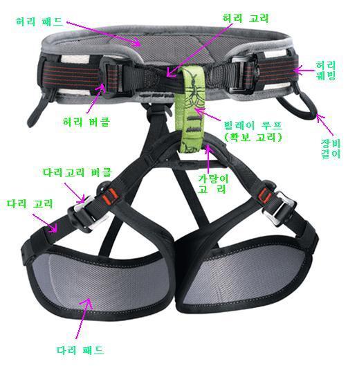 우리가 보통 착용하는 안전벨트를 하단안전벨트라 합니다. 하단안전벨트는 상하단안전벨트에 비하여 가볍고 착용이 쉬우며, 장비 등의 사용에 편리한 점도 있으나 몸의 균형과 안전 문제에 있어 불리한 것이 사실입니다. 그래서 국제산악연맹에서는 상하단안전벨트만을 공인해 주고 있는 것입니다.