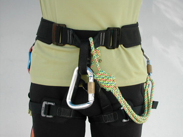 또한 하강기가 너무 몸에 바짝 붙어 허리를 조이기 때문에 오버행이나 긴 구간에서는 허리의 통증을 유발할 수도 있습니다. 따라서 22~28kn의 장력과 함께 몸과 적절한 유격이 있고 가장 안전한 곳에 위치한 확보고리에 장착하는 것이 좋답니다.