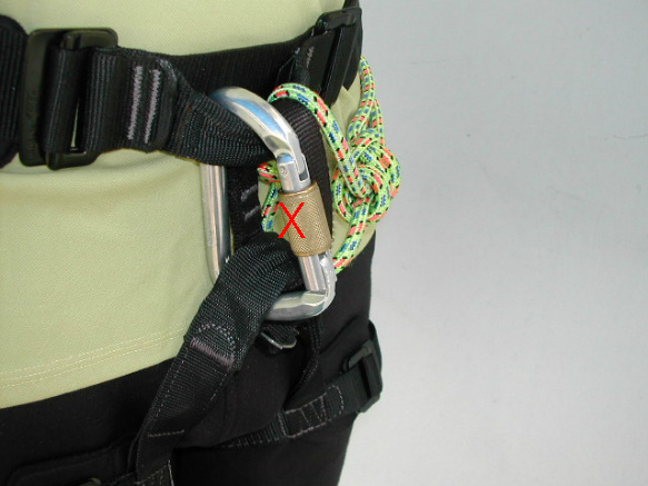 위 사진처럼 잠금비너를 허리와 가랑이의 고리를 통과시켜 하강기와 연결하는 방법은 위에 열거한 단점 외에도 하강 출발시에 잠금비너와 하강기의 위치가 제대로 되어 있더라도 완경사 부분이나 작은 테라스 등에서는 당겨지는 줄의 강도가 약해지는데 이때 허리와 다리벨트에 연결된 잠금비너의 위치가 횡으로 바뀔수 있습니다. 이렇게 되면 잠금카라비너가 버티지 못하고 열릴 수 있는데, 특히 8자하강기와 같이 장착한 경우는 더욱 그렇습니다. (모든 비너는 종으로 힘을 받을때만 18KN 이상의 힘을 받을 수 있습니다.)