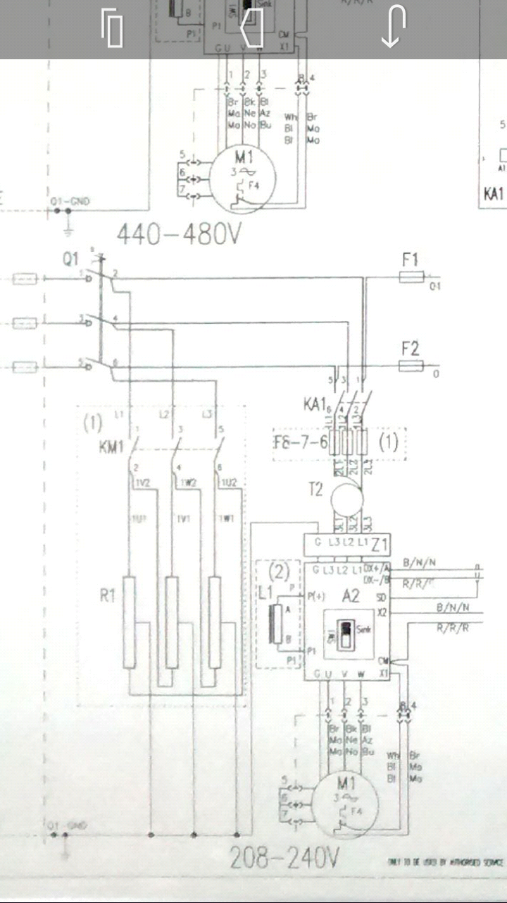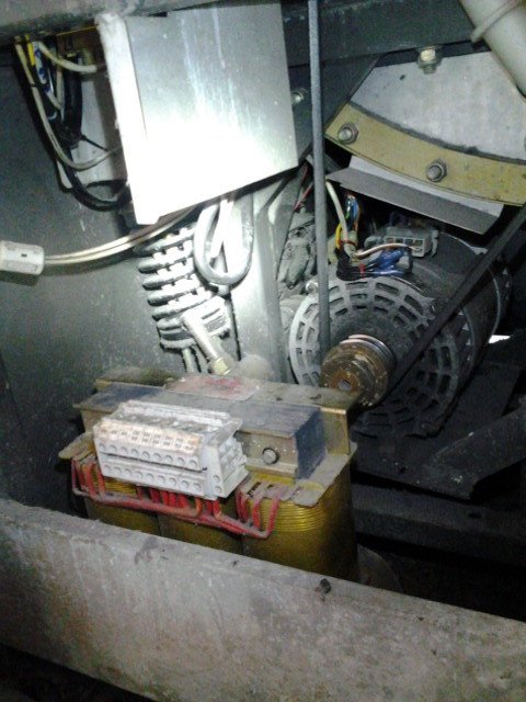 Washer 모델명은 HS-2055 Girbau Continental, soft mount, made in Spain 이었다. 장비 입력은 AC 208V 3phase. VFD는 2.2kW, 제어는 interlock 빼고는 통신으로 제어..... 대략 상황파악이되자 시간을 아끼기위해 인스트럭션 매뉴얼을 보면서 열나 풀고 뚫고 조이고 후다닥 마치고 VFD 전원을 연결하려고 보니 이게 웬일 그제서야 이상한게 보인다. 워셔 한 구석에 웬 승압 변압기가 있다. 아래 도면을 보세요. 208을 440으로 승압하여 공급하는 것이 아닌가. 분명 워셔 전원 연결부에 크게 208V라고 표기 해놓고 말이다. 그냥 연결했으면 폭죽놀이 할 뻔했다.