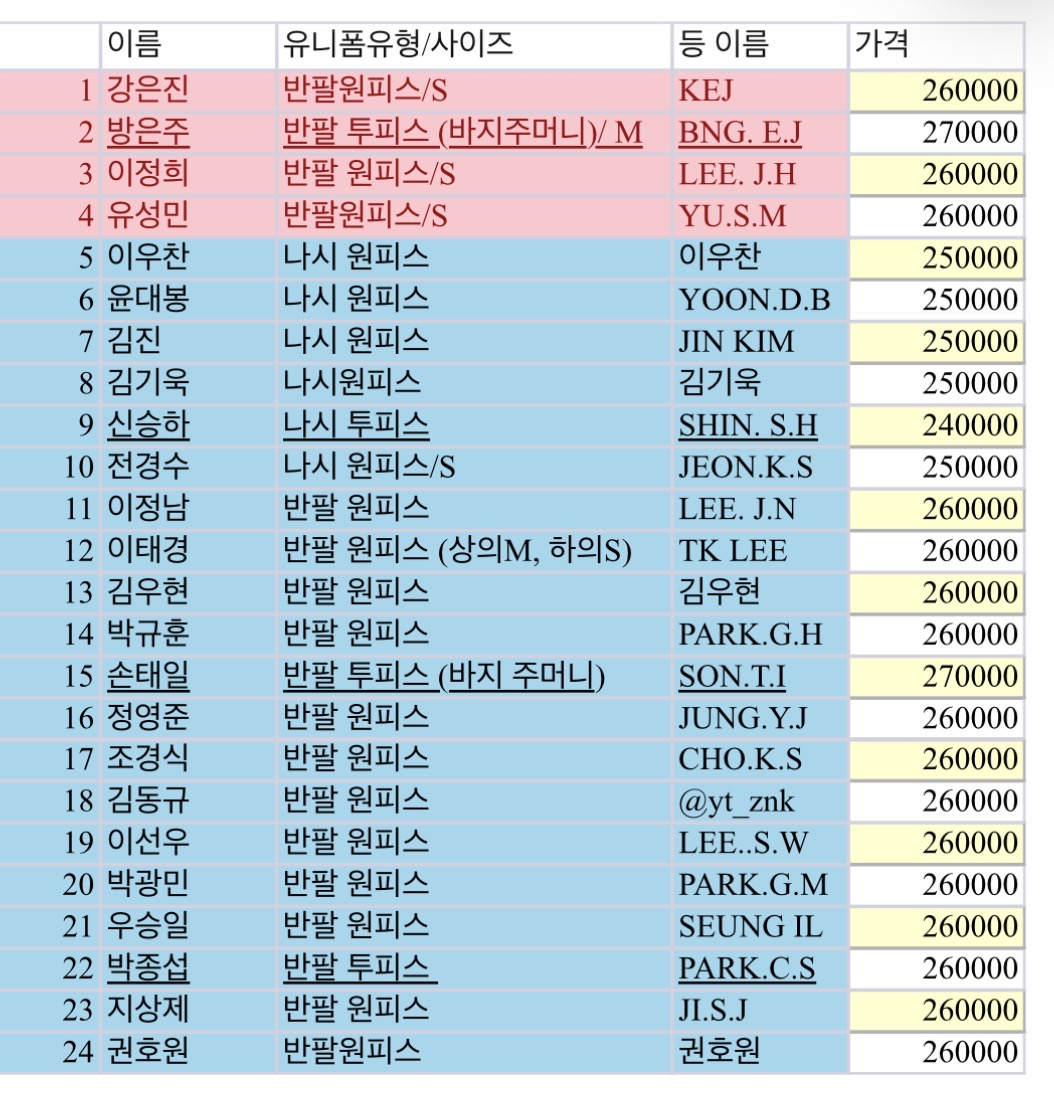 반팔 원피스 또는 투피스: 26만원, 나시 원피스 또는 투피스: 24만원