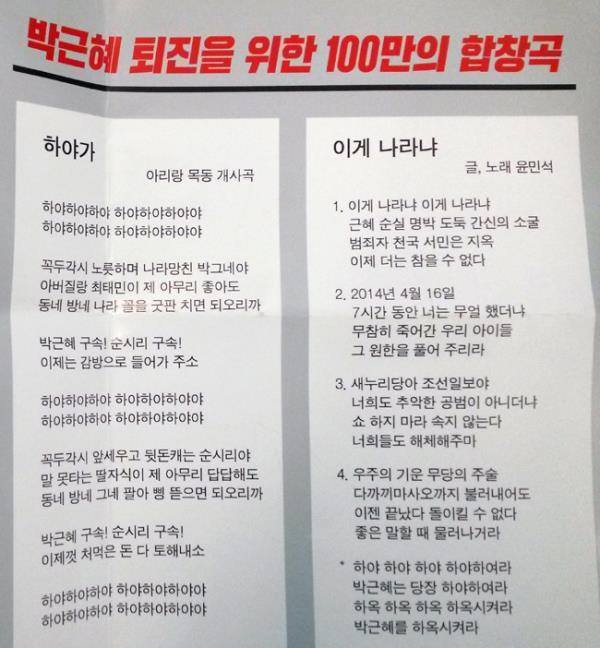 *후렴: 하야 하야 하야하여라 박근혜는 당장 하야하여라 하옥 하옥 하옥 하옥시켜라 박근혜를 하옥시켜라.
