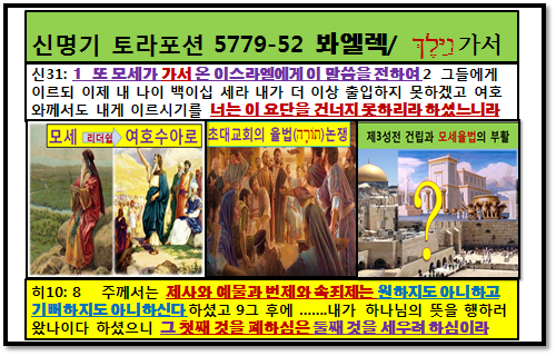 신명기토라포션 Vayelech / וַיֵּלֶךְ 네가 가서; 모세의 리더쉽이 여호수아로 이동하는 과정에서 나타나는 예수그리스도 작성자엘리야권|작성시간19.10.04|조회수104 목록 댓글 0 글자크기 작게가 글자크기 크게가 2019 년 10 월 5 일 샤밧예배 말씀: 모세로부터 여호수아로 이동하는 구속사의 리더쉽 다음검색 현재 게시글 추가 기능 열기 북마크 공유하기 신고 센터로 신고 댓글 댓글 0 댓글쓰기 답글쓰기 댓글 리스트