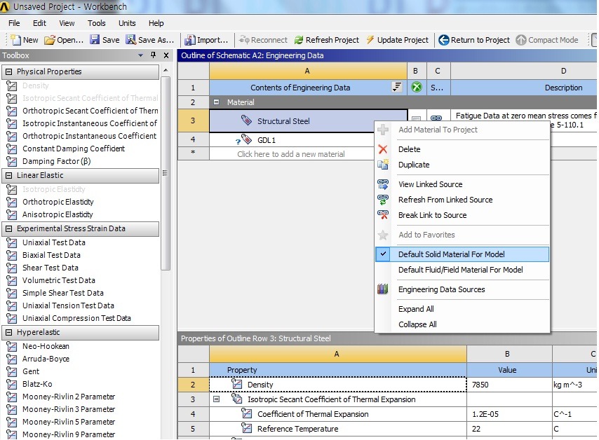 오늘 부터 안되네요... 엔지니어링 데이터에 들어가 structral steel을 solid의 기본 값으로 지정해도