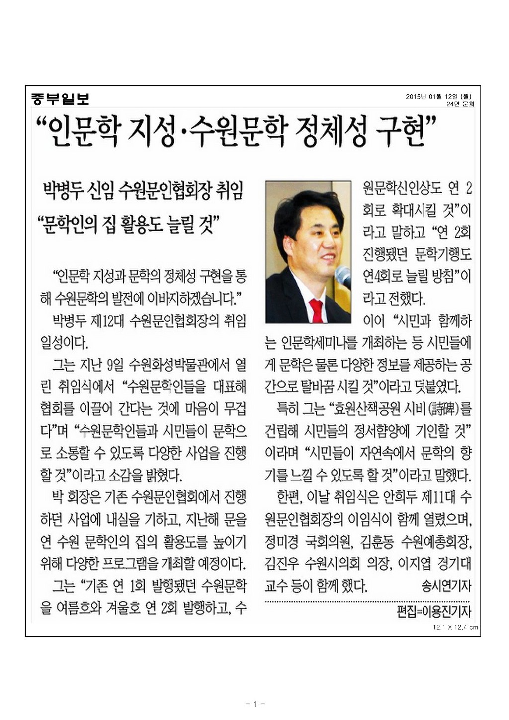 중부일보-본회 박병두 회장님이 수원문협 회장이 되셨습니다. 작성자비단길 서봄자|작성시간15.01.14|조회수54 목록 댓글 4 글자크기 작게가 글자크기 크게가 다음검색 현재 게시글 추가 기능 열기 북마크 공유하기 신고 센터로 신고 댓글 댓글 4 댓글쓰기 답글쓰기 댓글 리스트 작성자비단길 서봄자 작성자 본인 여부 작성자 | 작성시간 15.01.14 우리 회장님, 감투가 또 하나 생겨서 .....바쁘실 틴디.........어짜쓰까요잉........... 작성자김애진^^ | 작성시간 15.01.18 다시 한번 감축드리옵니다 회장님~^^ 작성자인송 박병두 | 작성시간 15.01.18 감사합니다 모두가 아름다운 길을 찾아 보답하겠습니다 작성자순효 | 작성시간 15.02.12 추카 드려요,^^ 댓글 전체보기
