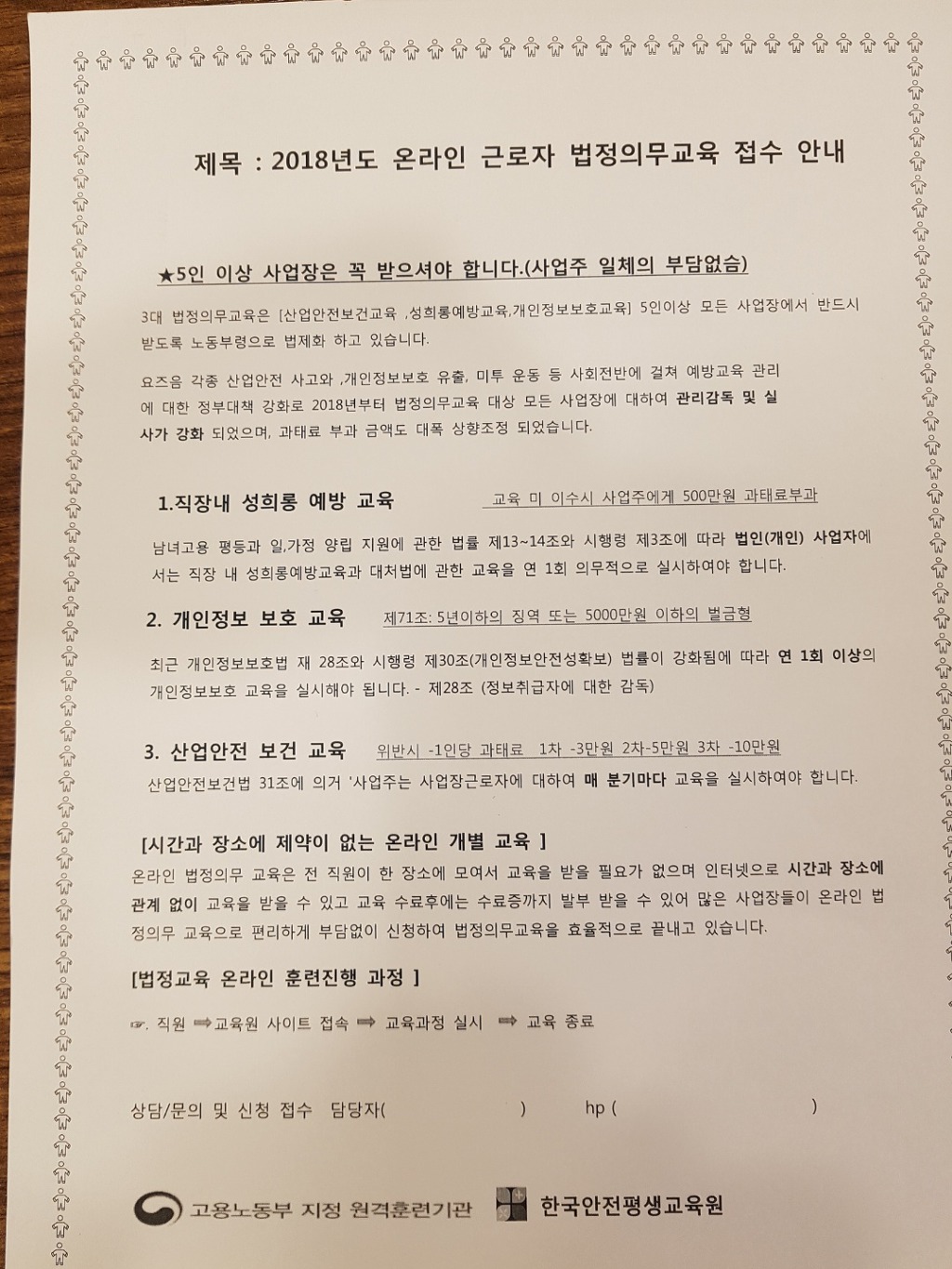 요즈음 각종 산업안전 사고와 개인정보 보호유출, 미투 운동 등 사회 전반에 걸쳐 에방 교육관리에 대한 정부 대책강화로 2018년부터 법정 의무교육대상 모든 사업장에 대하여 관리감독 및 실사가 강화 되었으며 과태료 부과 금액도 대폭 상향 조정 되었습니다.