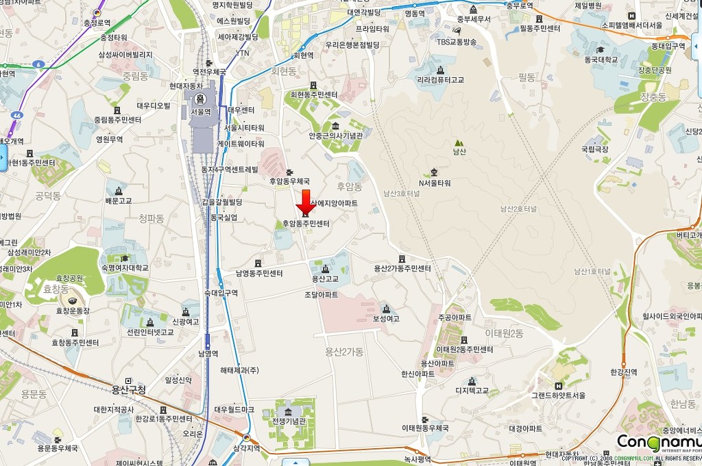 <약도> 아래 용산공원과 남산(N서울터워)을 연결하고 있는 굵은 붉은색 부분이 해방촌 부분임.