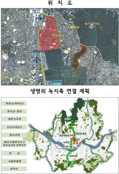 한국전쟁 직후부터 이북5도 실향민들이 하나둘씩 모여 살기 시작해 이름 붙여진 서울 용산동2가 ‘해방촌’. 수많은 애환을 뒤로하고 해방촌 일대가 2016년까지 철거된다. 서울시는 지난 5월 해방촌(5만 7000㎡) 일대와 국방부 소유의 군인아파트 부지(4만 7000㎡) 등 총 10만 4000㎡를 폭 100~190m, 길이 700m 규모의 ‘남산 그린웨이’로 조성해 남산~용산공원~한강을 잇는 녹지축으로 조성하겠다고 밝혔다. 철거민들은 후암동, 갈월동 일대의 재개발지역(33만 4700㎡)으로 옮겨 살게 된다. 철거 계획이 발표된 해방촌 지역 주민들과 시민들에게 남산 그린웨이의 ‘빛’과 ‘그늘’은 무엇일까요?