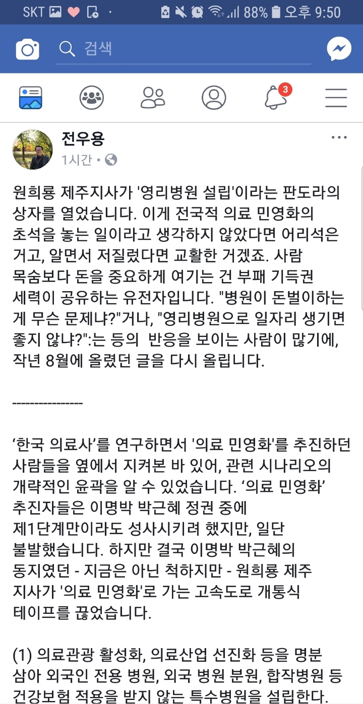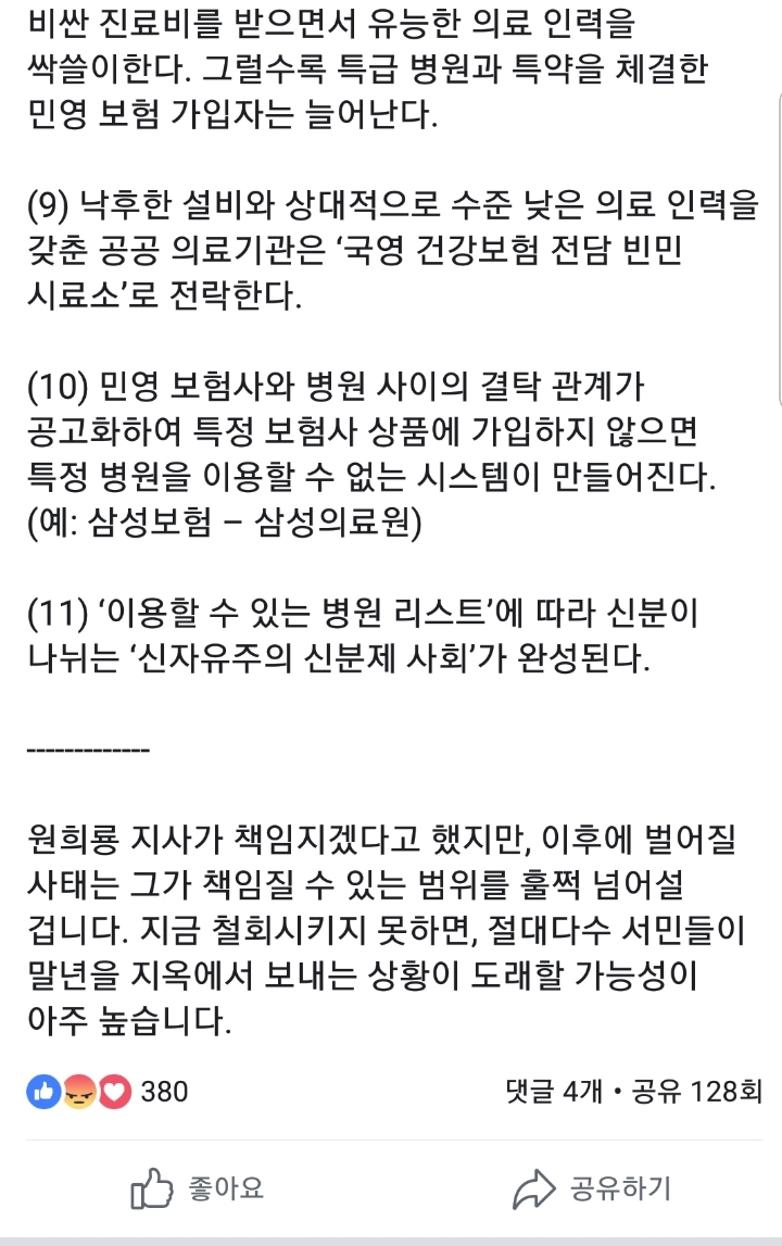[SNS]전우용 페이스북(원희룡의 영리법인 설립에 대한 생각) 작성자아모트|작성시간18.12.06|조회수798 목록 댓글 12 글자크기 작게가 글자크기 크게가 https://www.facebook.com/100001868961823/posts/2350655231673419/ 다음검색 현재 게시글 추가 기능 열기 북마크 공유하기 신고 센터로 신고 댓글 댓글 12 댓글쓰기 답글쓰기 댓글 리스트 작성자DuBuJoRim | 작성시간 18.12.06 미쳤네 ;;; 작성자덤다 | 작성시간 18.12.06 끔찍하다.지금은 아니더라도 아들 딸들이....겪을 금전적 고통 생각하면....돈 없는 사람은 죽어나가겠구나 작성자콰이강의다리 | 작성시간 18.12.06 진짜 답이 없다 작성자홍수현 | 작성시간 18.12.06 원희룡 ㄱㅅㄲ맞음. 의료민영화에 포석놓은거임 개새끼가 작성자zzzzZZZZZ | 작성시간 18.12.07 . 댓글 전체보기
