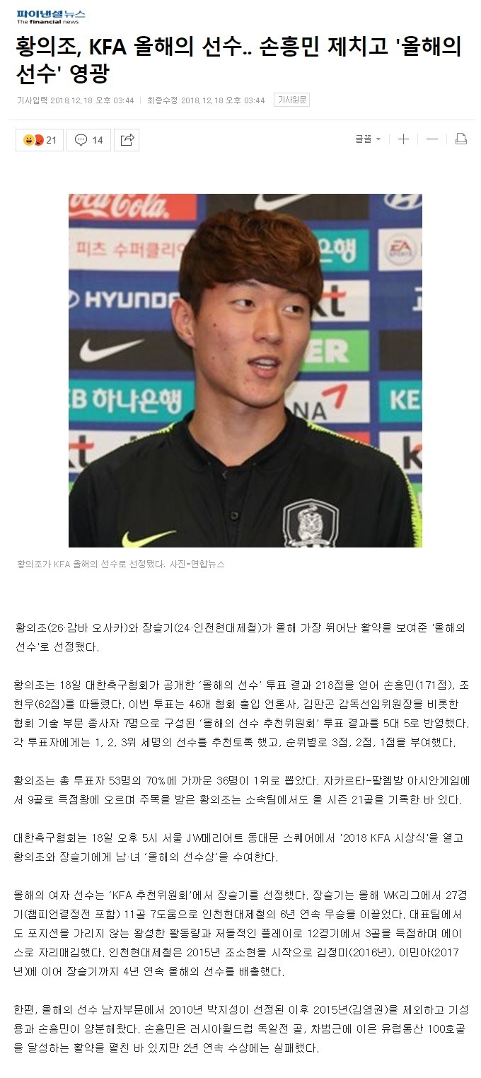 황의조, KFA 올해의 선수.. 손흥민 제치고 '올해의 선수' 영광 작성자소년명수|작성시간18.12.18|조회수1,693 목록 댓글 31 글자크기 작게가 글자크기 크게가 https://sports.news.naver.com/kfootball/news/read.nhn?oid=014&aid=0004146300 다음검색 현재 게시글 추가 기능 열기 북마크 공유하기 신고 센터로 신고 댓글 댓글 31 댓글쓰기 답글쓰기 댓글 리스트 작성자Happy0906 | 작성시간 18.12.18 작성자아이맥스 | 작성시간 18.12.18 빛빛빛 작성자디비디비딥 | 작성시간 18.12.18 ???:수상도 인맥아니냐!!! 작성자다르미안해치차흥 | 작성시간 18.12.18 ㅊㅋㅊㅋ 작성자Soccer | 작성시간 18.12.18 댓글 전체보기