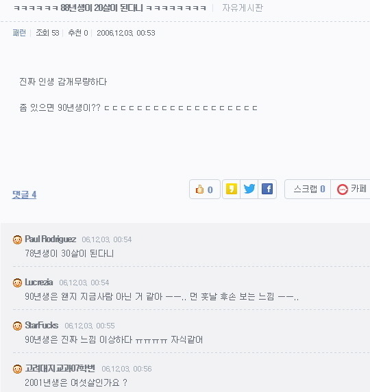 88년생이 20살이 된다니ㅋㅋㅋ...jpg 작성자크리스티아누 호날두(맨유, 33세)|작성시간19.01.01|조회수434,136 목록 댓글 15 글자크기 작게가 글자크기 크게가 벌써 13년전ㅋㅋ 다음검색 현재 게시글 추가 기능 열기 북마크 공유하기 신고 센터로 신고 댓글 댓글 15 댓글쓰기 답글쓰기 댓글 리스트 작성자영원한 캡틴박 | 작성시간 19.01.01 ㅠㅠ 작성자왼발의 긱스 오른발의 베컴 | 작성시간 19.01.01 아재들.. 작성자나도뚱냥이랑살고싶어 | 작성시간 19.01.01 ㅋㅋㅋㅋㅋㅋㅋㅋ 작성자Fc서울 | 작성시간 19.01.10 아재ㄷㄷ 작성자Nathaniel Clyne | 작성시간 19.01.10 아재라니ㅜㅜ 댓글 전체보기