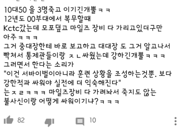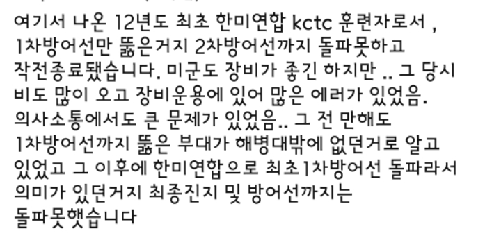 KTCT 훈련도 하고 중대급 마일즈 장비 훈련 해봤는데 마일즈 장비가 불편하고 나뭇잎에 숨은 애들조차 안죽지만 묘사력은 굉장히 우수함