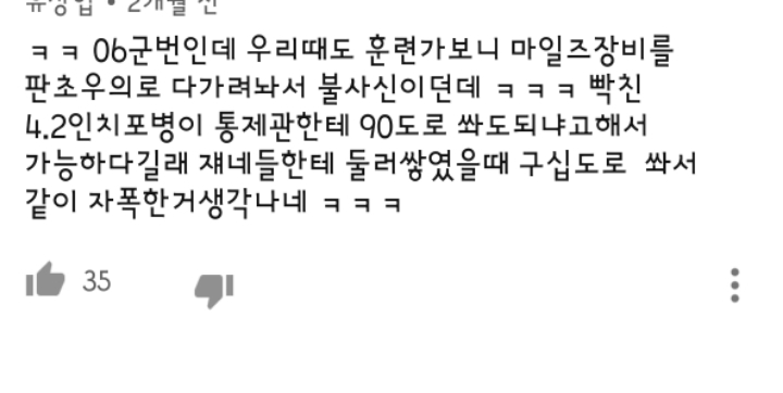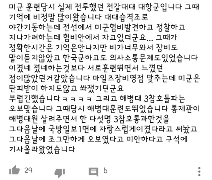 작성자호랭2 작성시간 19.01.12 11년 7월에 미군이랑 합동으로 했는데 준비과정이 진짜 힘들었던게 기억나네요. 훈련 끝나고 계곡에서 씻다가 안경 계곡물에 떠내려가서 당황한 기억도 있네요 ㅋㅋㅋㅋ