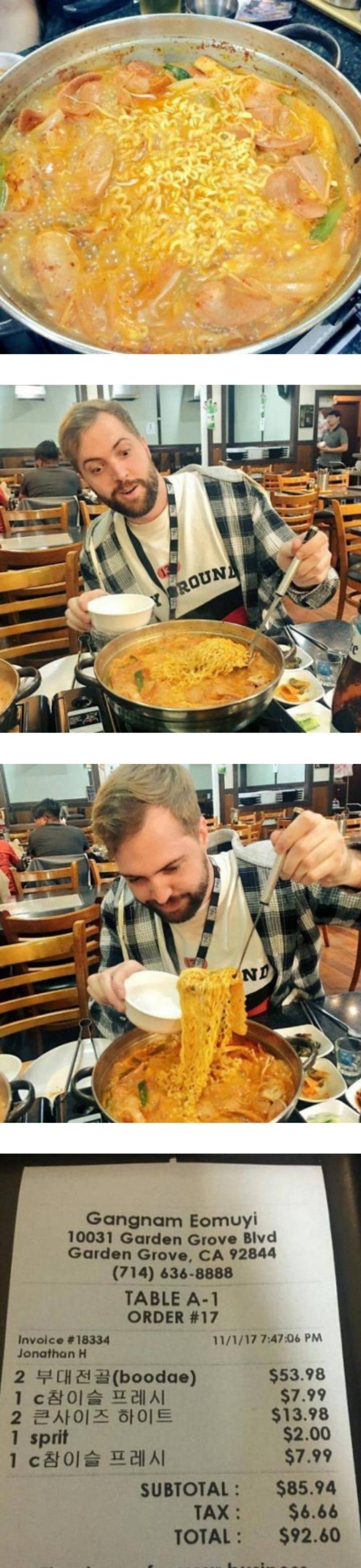 작성자판타스틱카카 작성시간 19.01.15 참이슬 8불이면 싼편인 듯. 부대전골은 양이 얼마나 되는지 모르겠지만, 좀 비싼거 같고... 놀라운건 뭔지 알아요? 저기다가 15% 팁까지 줘야함 ㅋㅋㅋㅋ