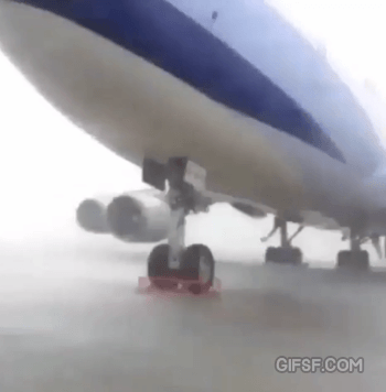 비행기가 강풍을 저렇게 맞으면 비행기는 불어오는 공기속도 만큼 달리고있는 효과가 생깁니다 그래서 비행기의 중력을 이길 만큼의 양력이 생기는 속도의 강풍이 불어오면 비행기가 저 상태에서도 뜰 수 있어요